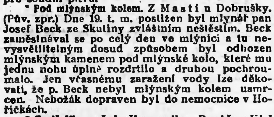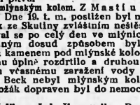 Jednou jeden mleč, za podzimní, večerní deštivé plískanice, jel s trakařem ze mlýna do Dobrého, když z lesního porostu uslyšel podezřelý, zvláštní šustot. Zastavil a se zatajeným dechem poslouchal. Vše utichlo, jen přirozený déšť a vítr šumí. Sotva učinil zase několik kroků zvláštní šustot začal znovu a to mnohem silněji. Při tom cítí, jak na trakaři přibývá náhle těžké váhy. Na tváři mu vyrazil studený pot, trakař chce pustit z rukou na zem, ale popruh zavěšen na rameni mu v tom brání. Zapřel se tedy vší silou a rychlý jeho krok bleskem se změnil v divoký úprk. Letěl do prudkého kopce jako ďas, až trakař za ním s hlukem poskakoval. Vrazil do první chalupy úplně vyčerpán, s duší na jazyku. Soused vyběhl ven, ozbrojen pořádnou břinkovicí, ale v záři světla lampy vidí našeho mleče s tváří strachy bílého jako mléko. Když se milý mleč trochu uklidnil. vysvětlila se celá příhoda. V kopci na silnici náhodou vysmekl se u trakaře »kocourek« (kolečko u trakaře) a postrašený mleč táhl ho za sebou bez kocourka. Proto se mu zdál tak téžký. Jemu ovšem jeho postrašená mysl posadila na trakař - strašidlo.