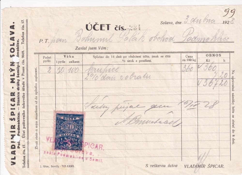 Mlýn byl postaven kolem poloviny 19. století. Roku 1930 patřil Emílii Špicarové.