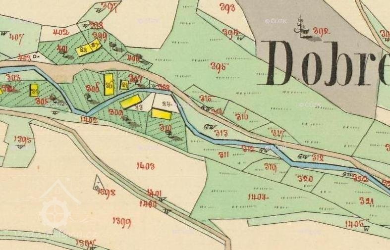 Michal Hofman ve své práci Místní a pomístní názvy Dobrého a přilehlého okolí píše: " Mlýn stával na Doberských Dolech pod strání směrem ke Kamenici na Kamenickém potoku. Byl vybudován z obyčejné chalupy roku 1718 nákladem Pavla Vernera, mlynáře doberského. Posledním majitelem byl Reichl / psán i Rajchl/, za něhož mlýn vyhořel a nebyl více obnoven. S tímto mlýnem souvisí i pomístní jméno Nade mlýnem, Nademlejnem...nazývá se jím nejen silnice ke Kamenici od poslední doberské chalupy čp.75 až nahoru na kopec, nýbrž i všechna pole ležící blízko pod i nad silnicí. Louce zabíhající k lávce lidé i po spoustě let říkají Podemlejnem. Náhon na tento mlýn vedl za čp. 73, 74, 76, 77 a 83 a jeho stopy jsou dodnes zřetelné."