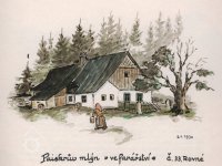 Mlýn stál úplně v lese, jen ze strany mlýnského průčelí byl malý sádek. Tam také stávala stará velká hrušeň, zvaná "horka". Podobala se mohutné lípě a byla uvnitř dutá. Na samotě u mlýna hnízdívala sova a zatoulala se sem i liška, zdomácněla tu velká užovka, která se každé ráno po dojení připlazila napít mléka - zkrátka byl to pravý lesní mlýn.