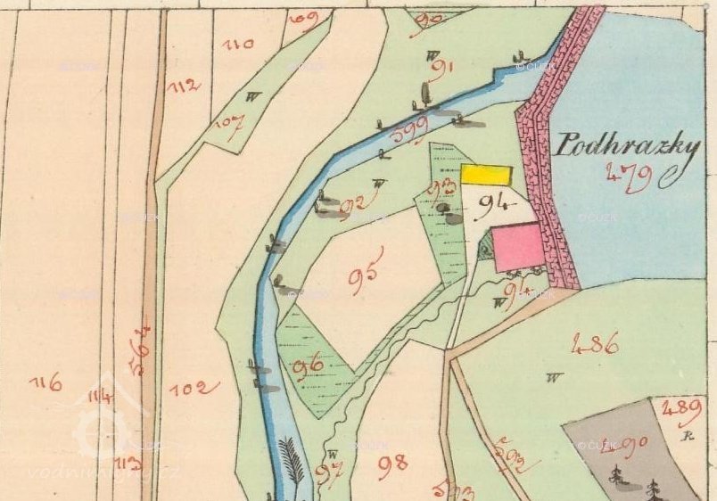 Vody užívá se k mletí obilí v jarní době, jelikož jindy vody není. Obilí mele se na dvou strojích (korčácích) horní vodou... Voda na stroje vpouští se troubou 6 ½ ° dlouhou, vysokou 14“, širokou 13“, která se stavidlem 14“ vysokým a 13“ širokým hradí... Voda smí se nadržovati, ale dle smlouvy postupní ze dne 31. prosince 1846 nepřílišně... Právo vodní zakládá se na smlouvě postupní z 31. prosince 1846... Majitel mlýna čp.62 jest povinen odváděti stádlecké vrchnosti 42 ?? roční činže za užívání vody...