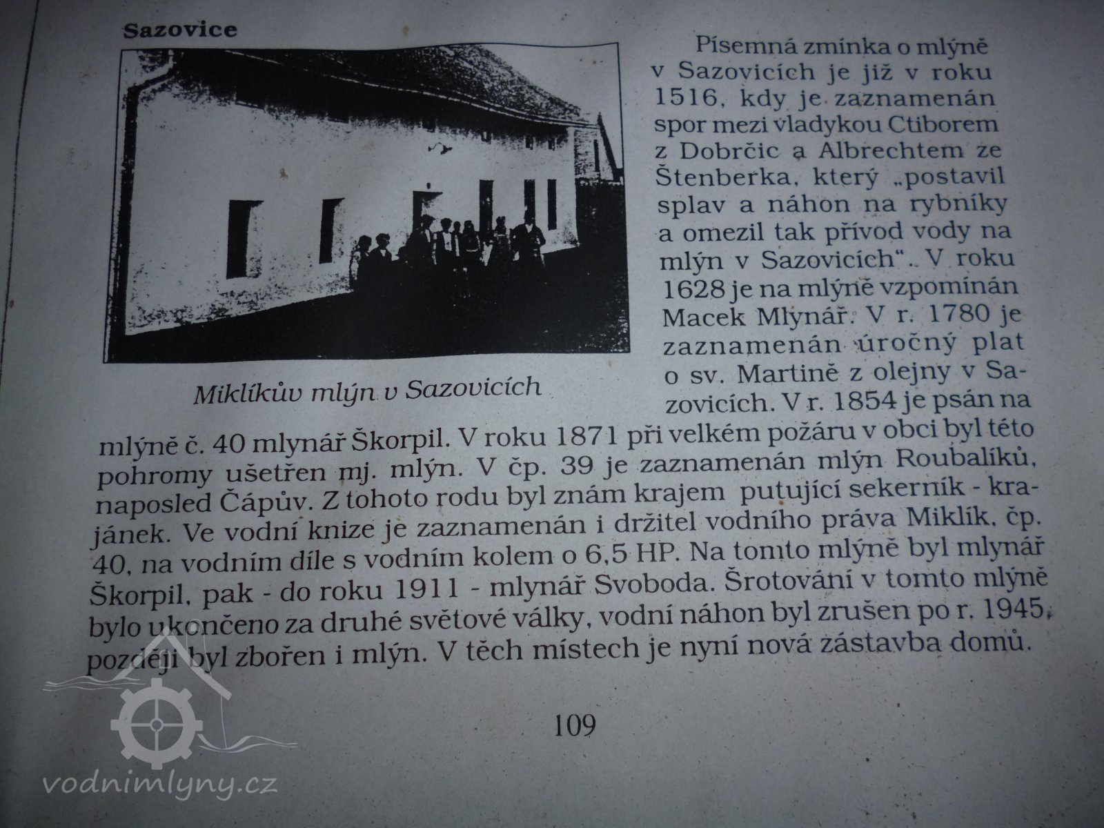 První zmínka o mlýnu je z r. 1516 v souvislosti se sporem mezi vladykou Ctiborem z Dobrčic a Albrechtem ze Šternberka, ktrerý postavil splav a náhon na rybníky a omezil tak přívod vody na mlýn v Sazovicích