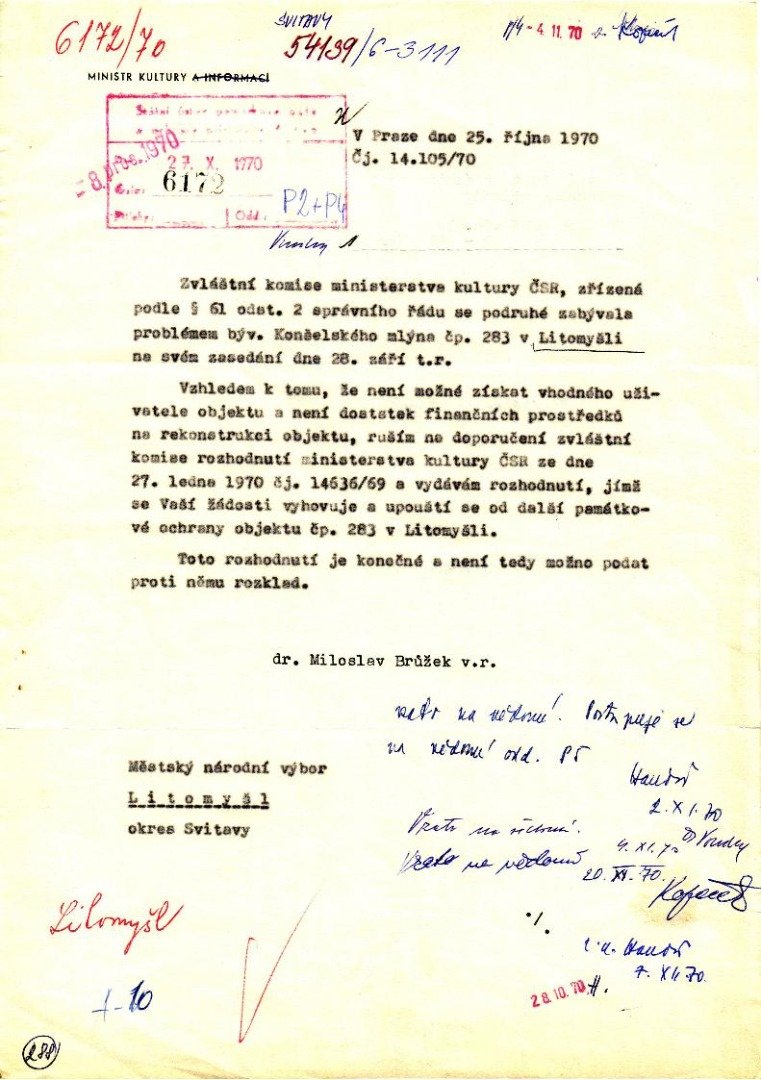 Konšelský mlýn, nazývaný též špitálský či šosovní spravovali mlynáři z rodu Podhajských. Roku 1624 Jiřík Podhajský a roku 1674 Řehoř Podhajský. Po Řehořovi roku 1679 hospodařila na mlýně vdova Dorota spolu se synem, v roce 1685 Jan Svoboda a roku 1687 Jan Semanský. Roku 1733 prodala a postoupila obec litomyšlská konšelský mlýn s loukou Jiřímu Hnátkovi za 700 kop rýnských. K povinnostem mlynáře patřilo na sv. Havla a Jiří „…pololetně pro chudé špitálníky a niekam při obci sloužící žita čistého 32strychů 2 wěrtele a 1 korec rozdá vlastním nákladem a každému špitálníkovi týhodně jeden bochník po jedný čtvrtci, který 11… vážiti má, vydati povinen bude…“. K tomu má pololetně platit 61 kr 42 dr při sv. Jiří a Sv. Havle, z louky neb zahrady po 5 kr 50 dr. „Neméně taky při nadepsaných terminech neb aučtech mlynářských dle starobylého obyčeje na autraty 1 zl 10 kr. Ittem jednou v roce dvě prasata na špek, které jemu z důchodu obecního koupené a dané budou.