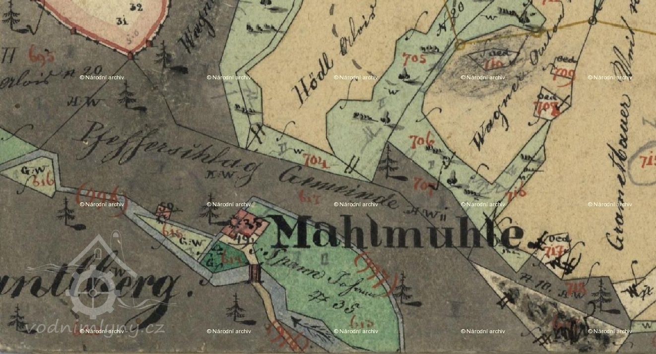 Objekt mlýna v katastrálním území Libínské Sedlo/Pfefferschlag/ je zobrazen na mapě Stabilního katastru:Čechy-4015-2, mapový list č.002.Původně se jednalo o dům čp.35/st.p.49-mlýn,obytné a hospodářské stavení a objekt mlýna/st.p.50.V roce 1931 po rekonstrukci bylo objektu na st.p.50 přiděleno číslo popisné 72.