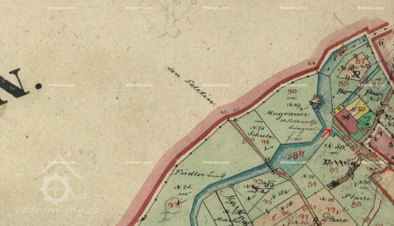 „Leží na pravém přehu řeky Blánice, z jejíhož pravého břehu odbočuje mlýnský náhon přivádějící vodu „Leží na pravém přehu řeky Blánice, z jejíhož pravého břehu odbočuje mlýnský náhon přivádějící vodu ku pohonu mlýnského zařízení. Za tím účelem je zřízen v řece pevný jez 17,1 m dlouhý. Ve svém středu má splav 8,4 m široký, opatřený v celé šíři prkennou podlahou. Přímo nad jezem odbočuje horní mlýnská stoka opatřená dvěma stavidly spouštěcími. Asi 10 m nad stavidly ústí do Blanice potok Pfarrbach, jehož vyústění opatřeno jest při pravém břehu kamenným tarasem. Ve vzdálenosti 5 m pod spouštěcími stavidlami nalézají se v lednici stavidla mlýnská, z nichž stavidlo na mlýnský žlab měří 1,34 m, jalový žlab 0,71 m. Ku pohonu mlýnského zařízení slouží jedno kolo na spodní vodu měřící v průměru 3,5 m. Šířka věnce obnáší 1,5 m. Pod mlýnem na spodní mlýnské stoce nalézá se pila, jejíž kolo měří 3 m v průměru a pohání jednu rámovou pilu a jednu lupenou.“