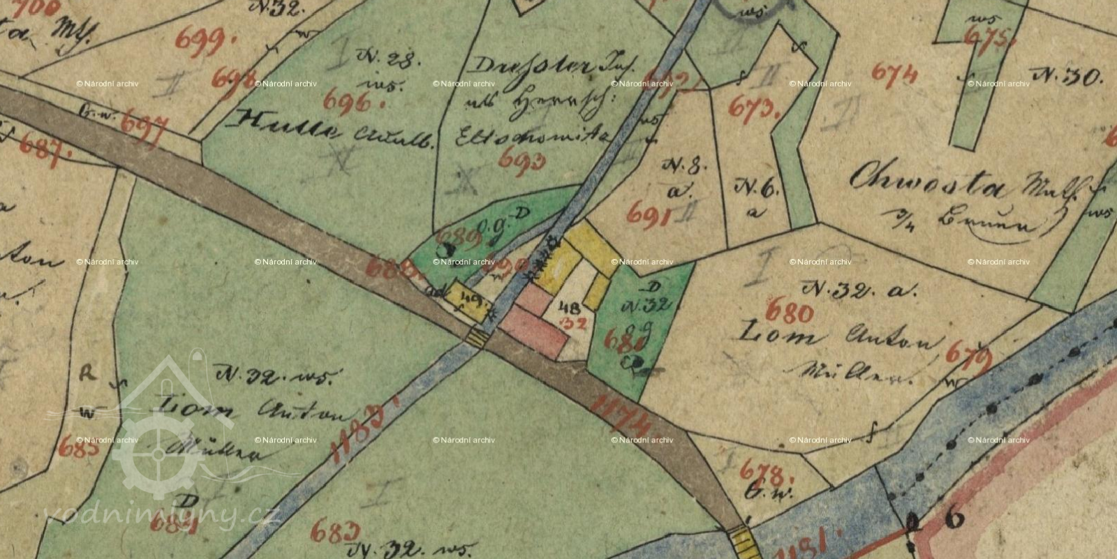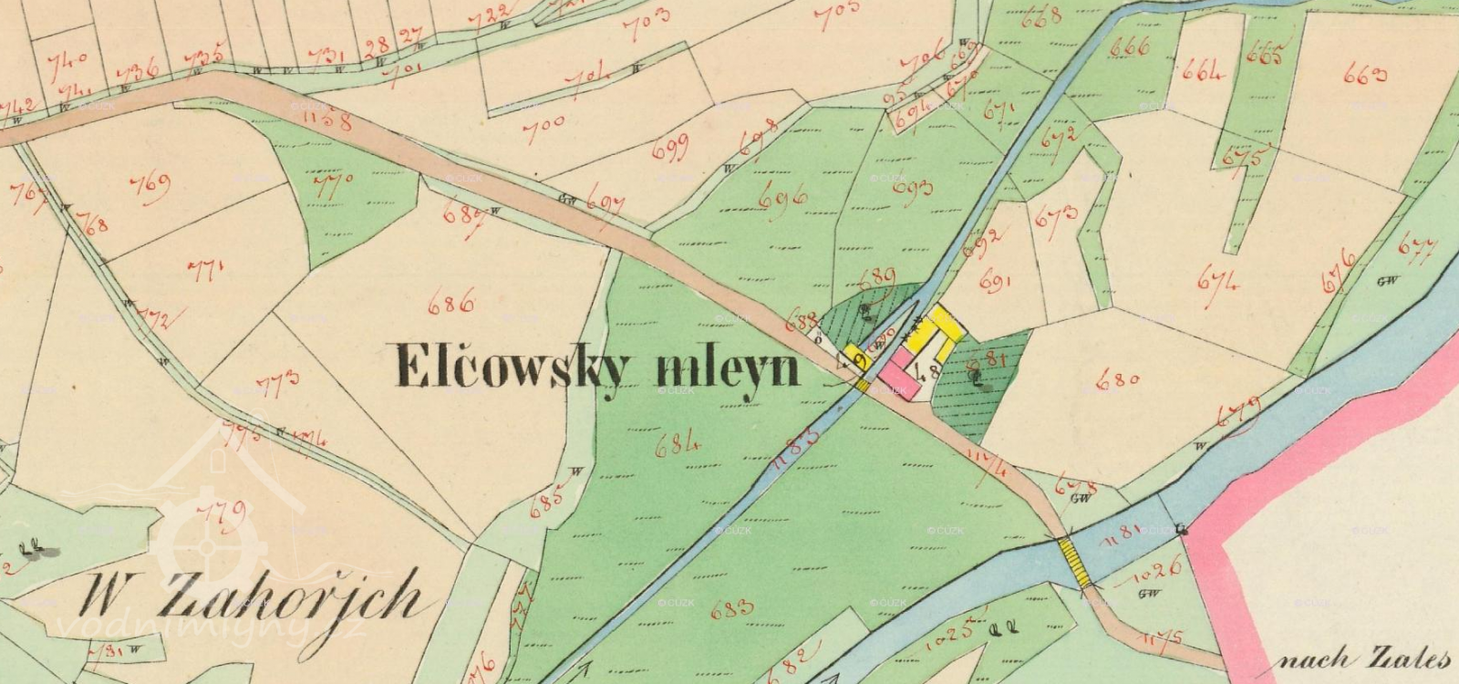 Velká areál mlýna, dnes značně přestavěného. Mlýn ležel na společném náhonu s výše položeným Bělohubých mlýnem (viz. vlastní karta).