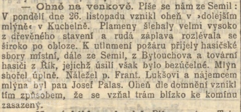 26. listopadu 1900 mlýn vyhořel. Majitel František Lukeš, nájemce Josef Palas. (RR)