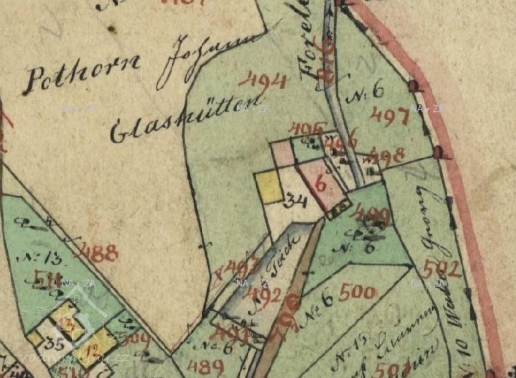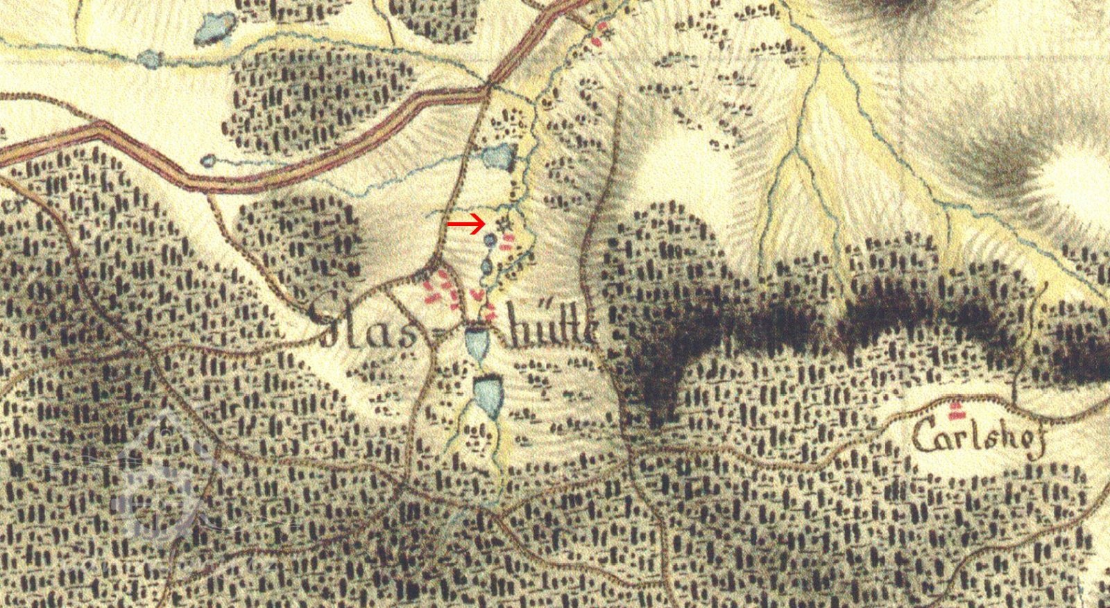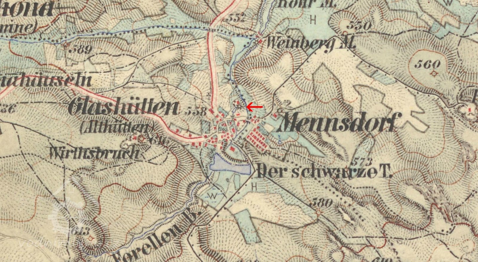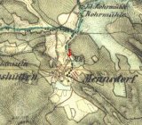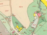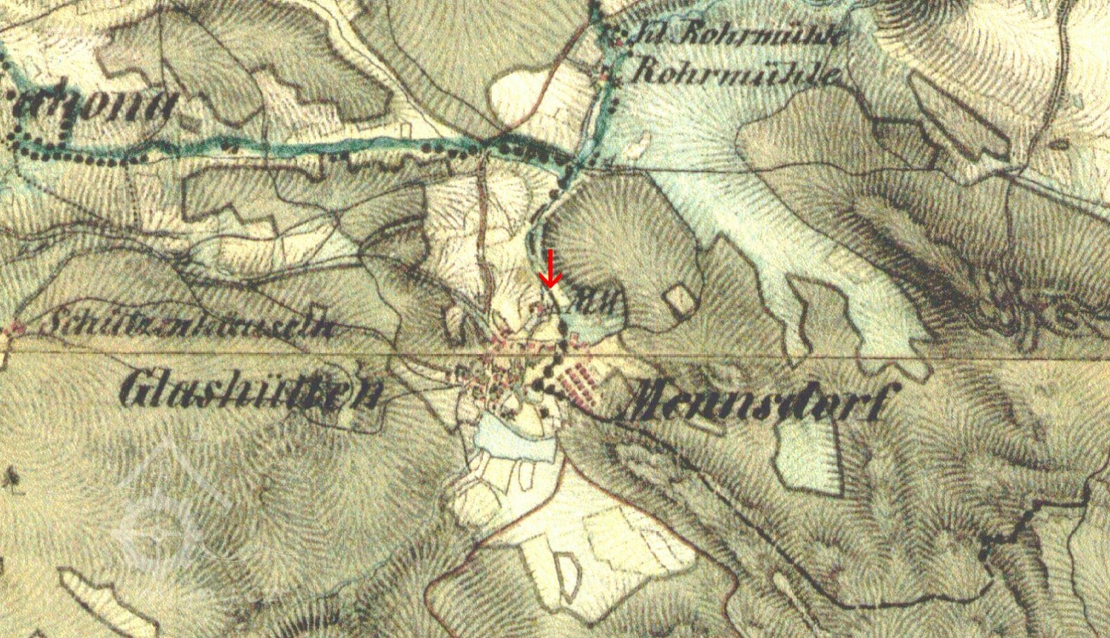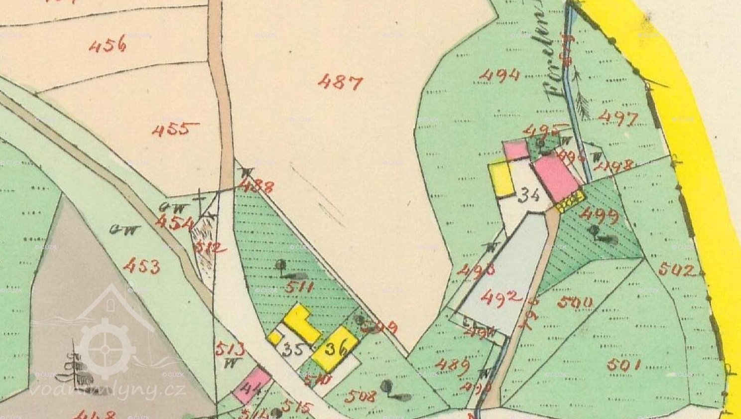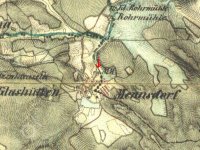 Mlýn (nebo stavba na vodní pohon) je vyobrazen již na I. vojenském mapování. Na II. vojenském mapování je již mlýn jasně označen zkratkou MM (Mahl Mühle). Je otázka jak tedy interpretovat výše zmíněnou žádost z roku 1878. (RŠ)