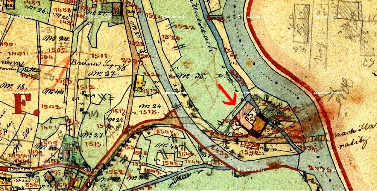 Václav Jůna, 50 let. Koupil jsem ten mlýn od Václava Polmy; jest tuze starý, nevíme pamětníka. Někdo praví, že jest na obci. Panský byl od času Vacka Palmy.Hlavní řeka vždy šla tak, jako nyní pamětníka není. Pole k tomu mlýnu leží na držkovské starně. Já mám koupený mlýn s poli a lukami pod ourok, který odvádím mil. vrchnosti na kanceláři. Z pekaření připlácím do Držkova i do Haratic, že asi před 12 lety Adam Kopal, rychtář držkovský, Jan Merklas, konšel a Jan Rezler, obecní, chtěli, abych jim připlácel kontribuce, že mám pole na jejich straně a já koupil mlýn s polma pod ourok bez platu, já jsem si vyžádal, aby mne mil. vrchnost připsala k rychtě haratické, že se nemohlo dokázat, že by z toho pole byla kontribuce, mil. pán dal staré knihy otevříti. Z toho mlýna se mrtví pochovávali do Držkova, do Olešnice žádné - nepamatuji. Za času Polmy, asi před 30 lety, bylo velké zvodnění, voda k Plavům protekla, on dal jizby dělati, jak posavad stojí. Prve jez býval níž než nyní. Kdyby jez od haratické strany se zkazil, nemohl by mláti. Na to všecko já přísahati mohu a se podepisuji.