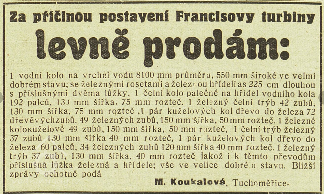 r. 1865 - Vilém Koukal koupil od Antonína Šimáčka vodní mlýn a přestavěl ho na parní mlýn, umělecký. 6.5. spuštěn parní stroj, v srpnu zahájeno mletí.