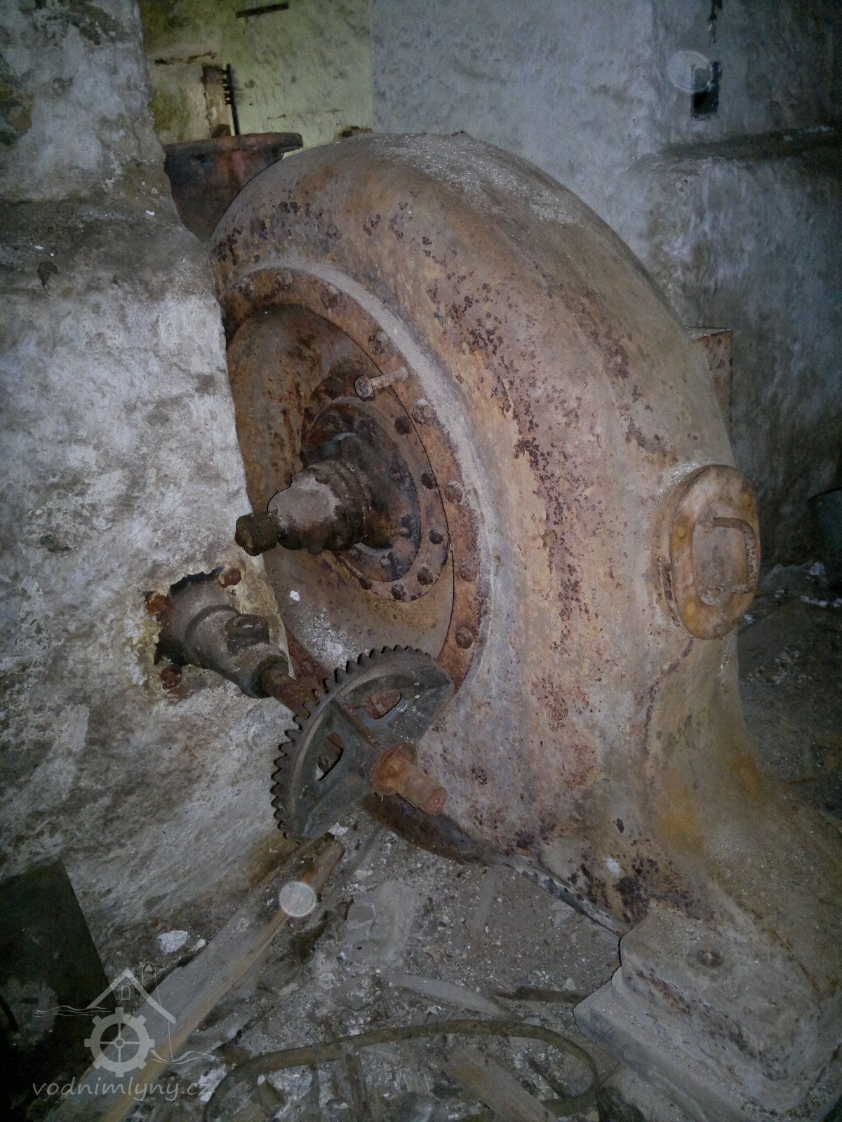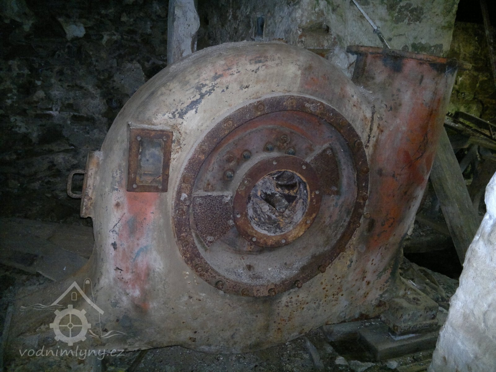 Do současnosti dochovaná Francisova spirální turbina s horizontální hřídelí a zbytek její regulace, na turbíně chybí savka.