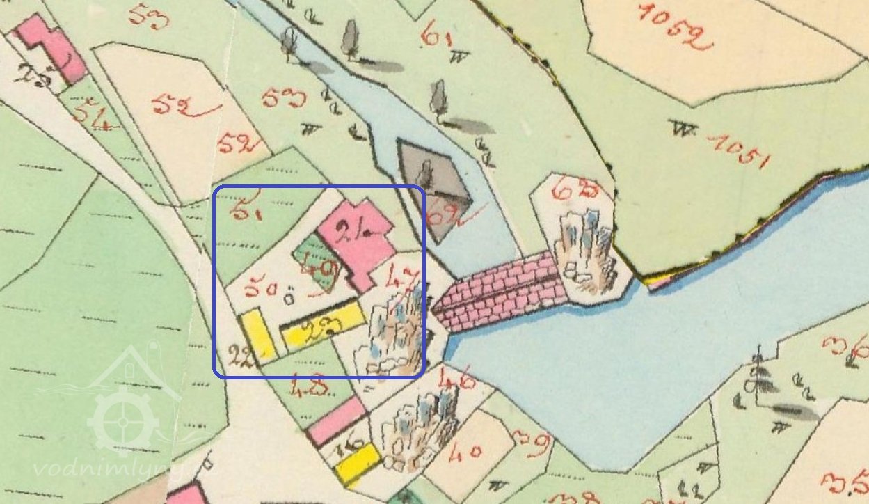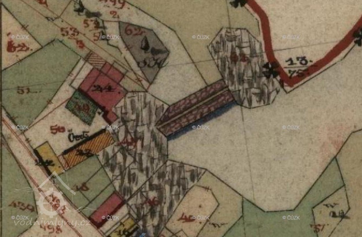 Mlýn s pilou z doby kolem roku 1830. Současná podoba vychází z doby po roce 1914, kdy mlýn vyhořel.