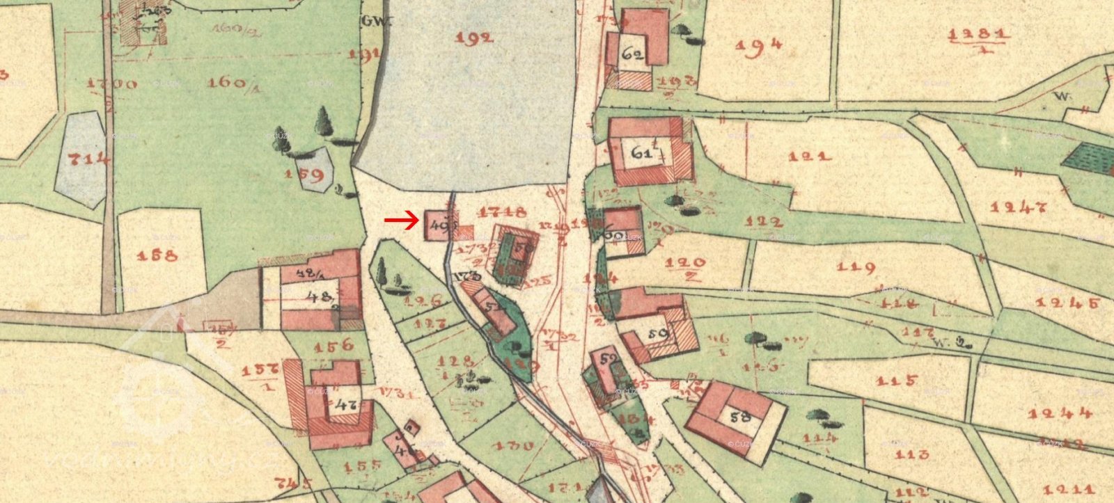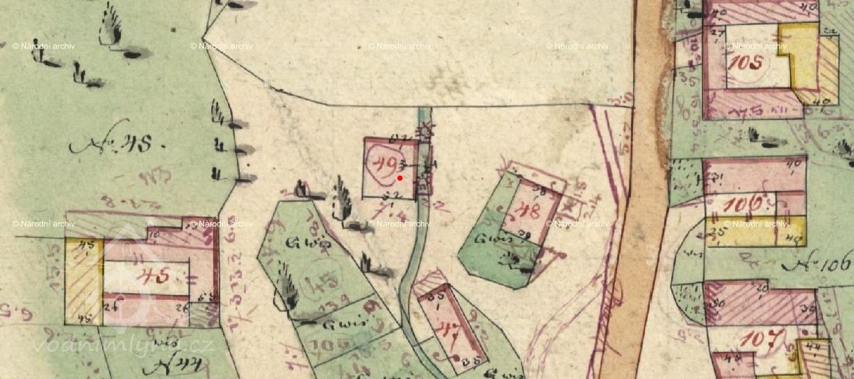 PopisV roce 1930 bylo u mlýna vodní kolo na svrchní vodu o hltnosti 170 l/s, na spádu 4 m a výkonu 6 HP.