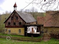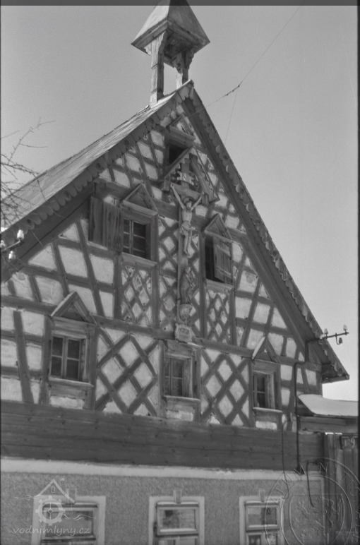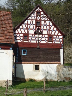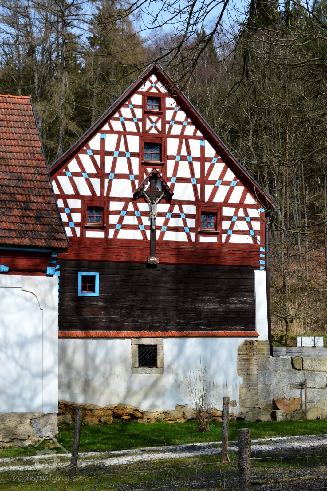 zdobený hrázděný štít mlýnu, 04 2014, © Jaroslav Vyčichlo, (Prvky na obrázku: hrázděný štít, umělecké prvky (sochy, malby, reliéfy))