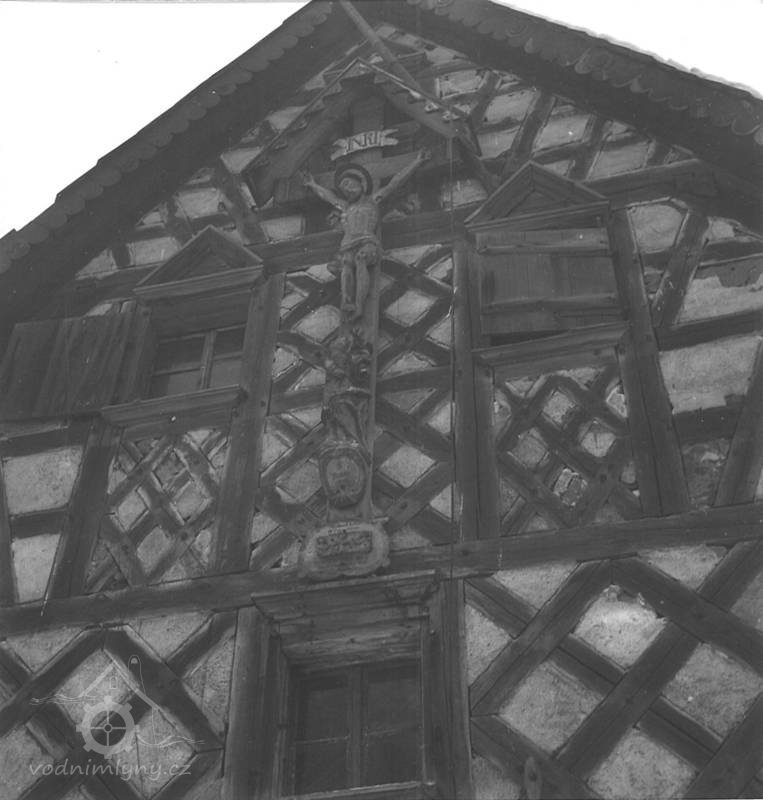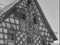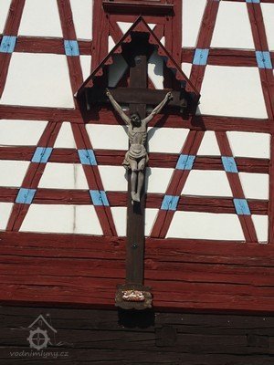 obnovený krucifix ve štítu, 04 2014, © Jaroslav Vyčichlo, (Prvky na obrázku: hrázděný štít, umělecké prvky (sochy, malby, reliéfy))