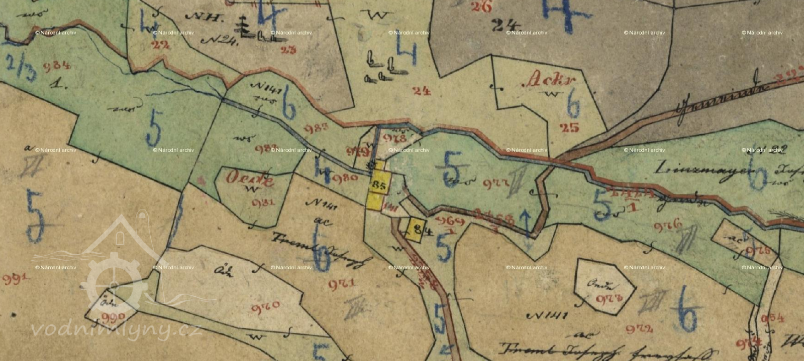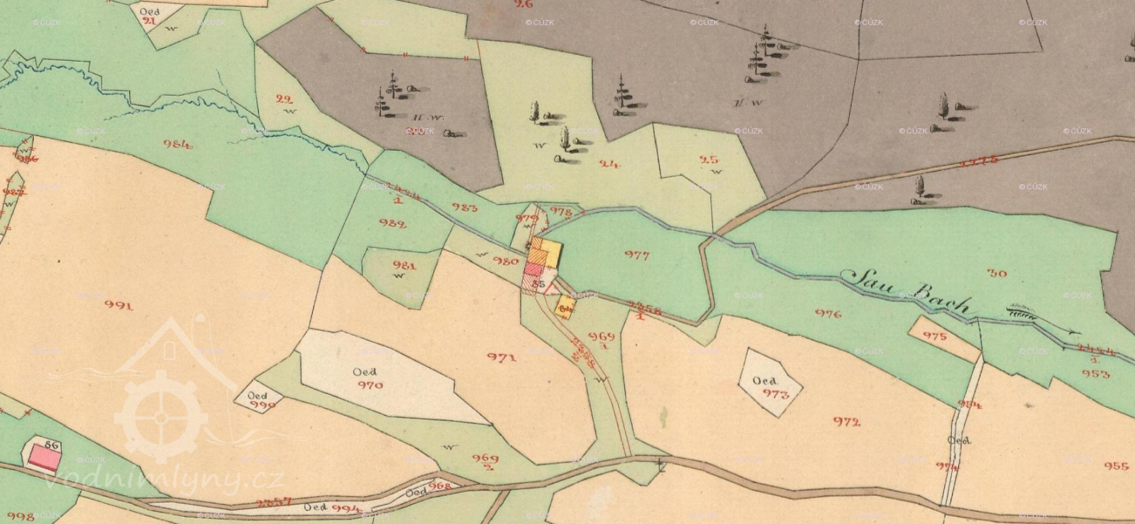 Jednalo se o samotu v katastrálním území Hamry/dnes Hamry na Šumavě/.Mlýn, přesněji obytné a mlýnské stavení čp.9 se stájí a stodolou stálo na stavební parcele č.85.Nemovitost je zobrazena na mapě Stabilního katastru :Čechy:1768-1, mapový list č.005.Již v době vzniku mapy Stab.katastru mlýn patřil rodině Treml.K vlastnictví: stav do r.1945: