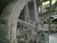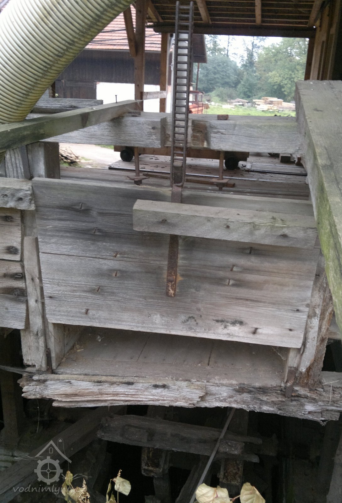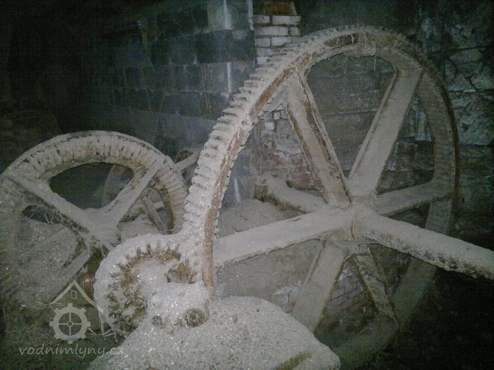 celkový pohled na paleční převody pily od vodního kola, 2013, © David Veverka, (Prvky na obrázku: transmise, řemenice, převody)