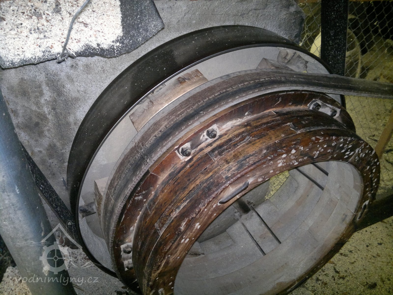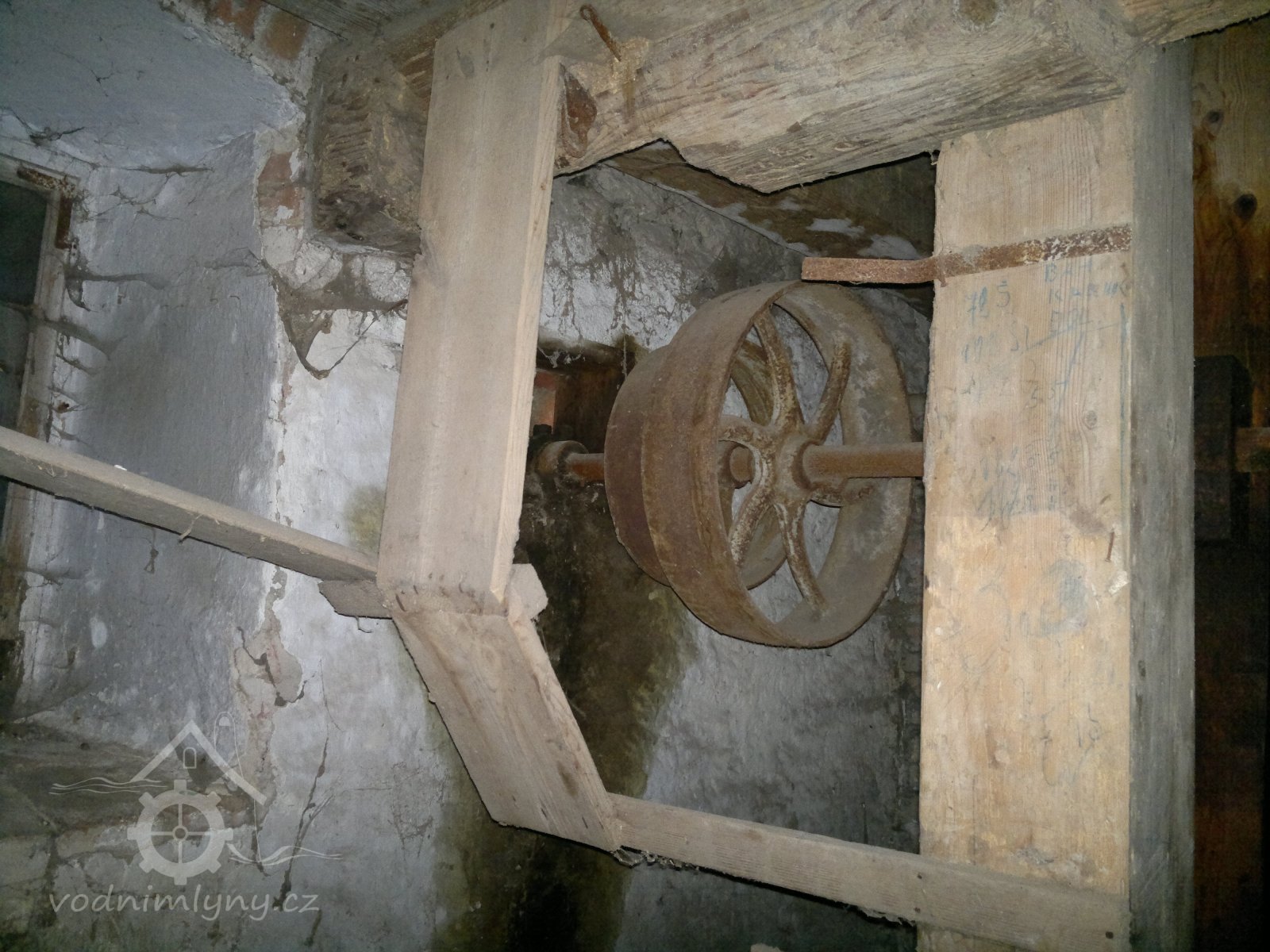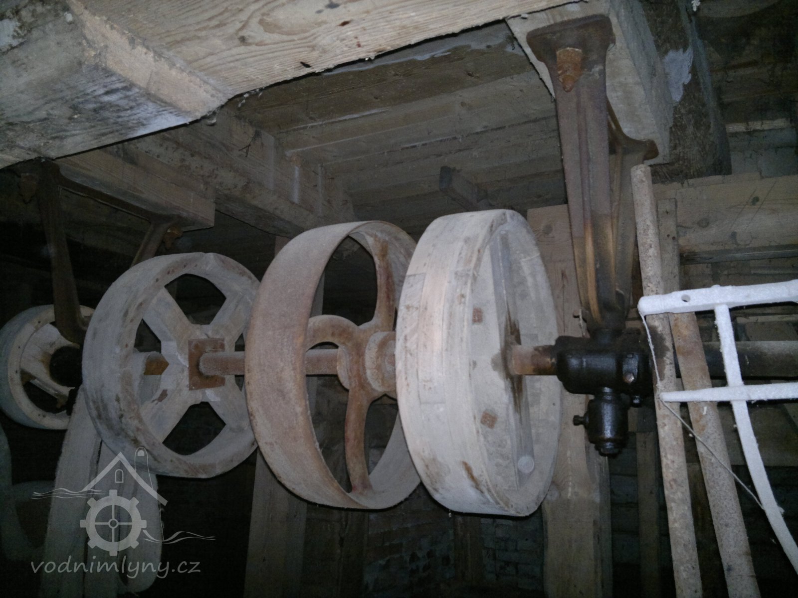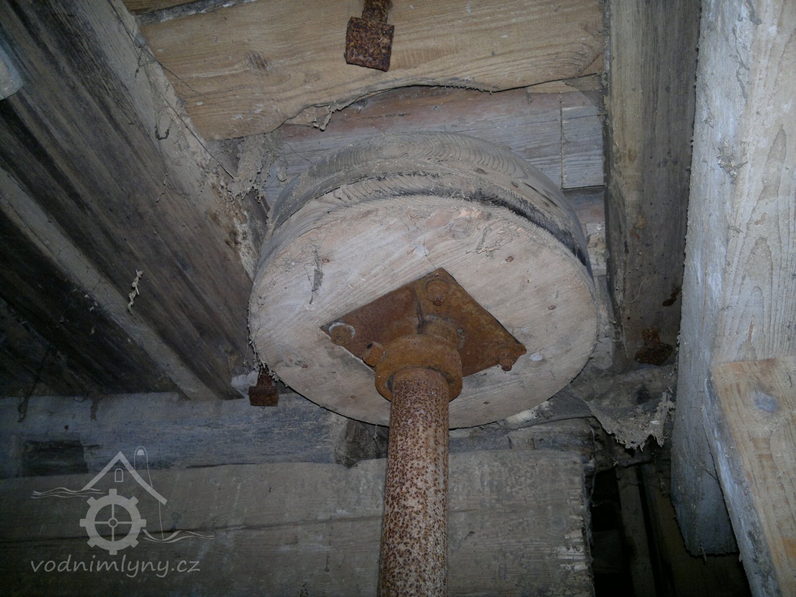 pohon mlecích kamenů - vertikální pohonná hřídel s řemenicí, 2013, © David Veverka, (Prvky na obrázku: transmise, řemenice, převody)