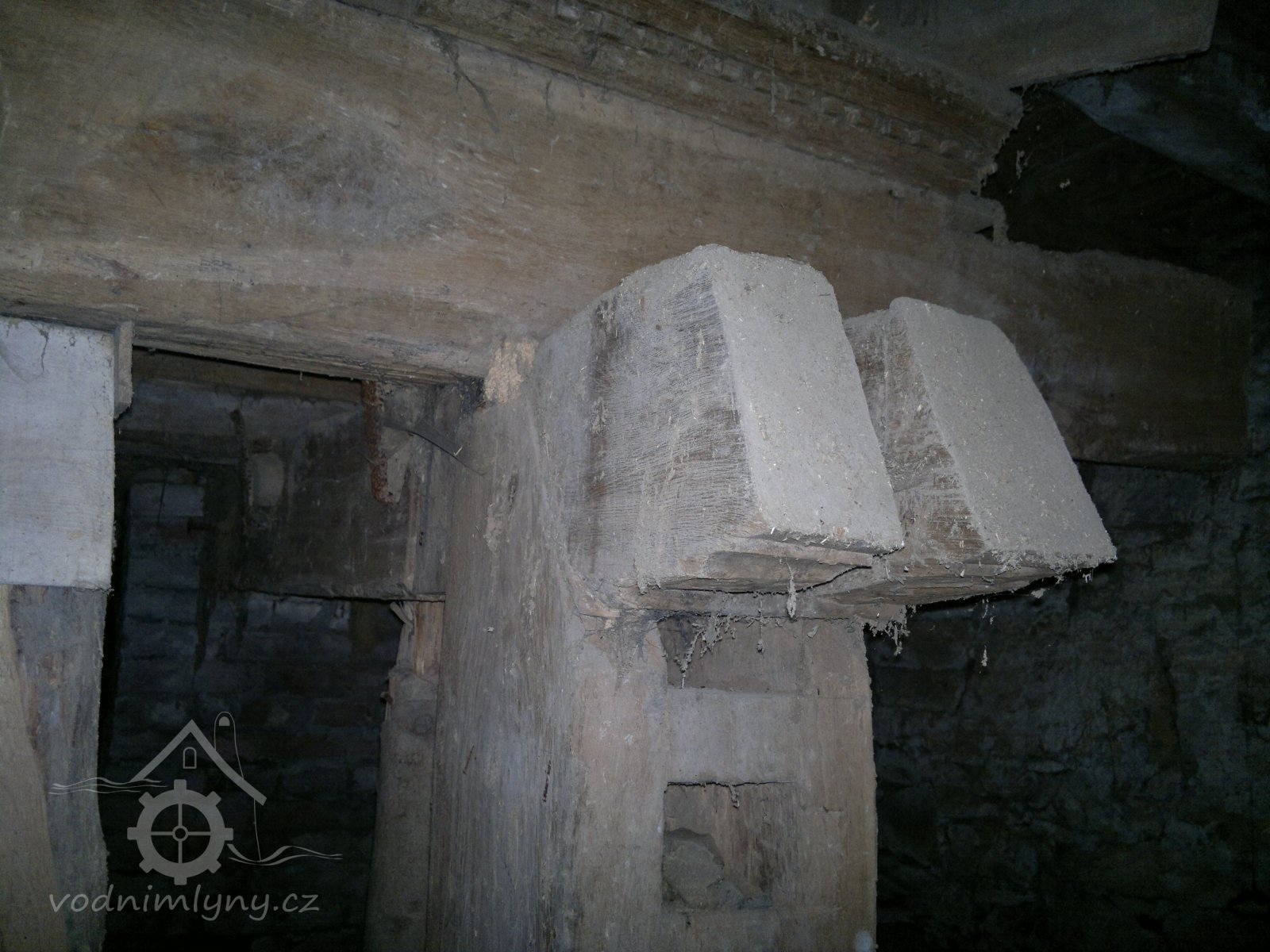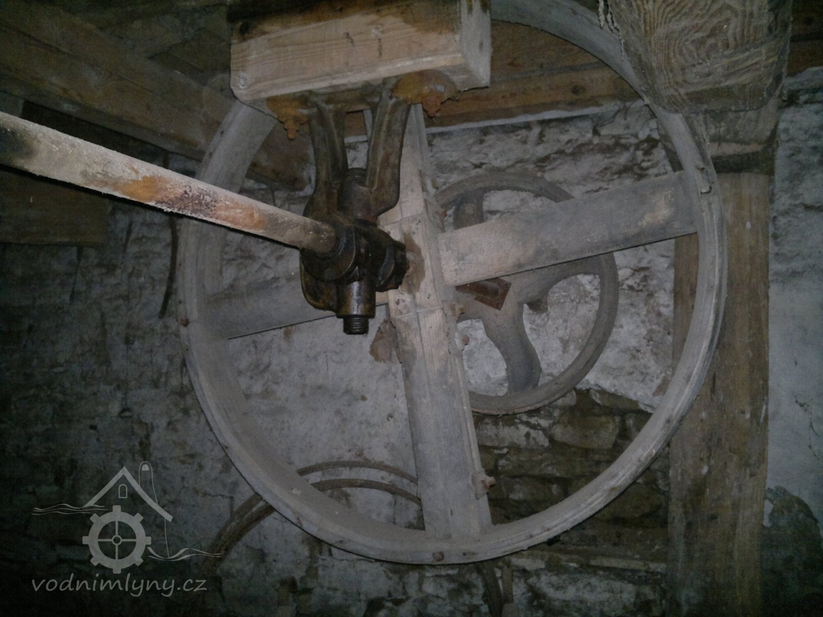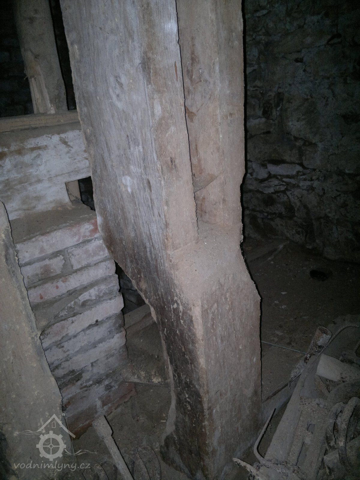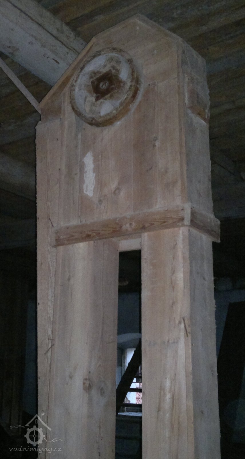pohon mlecích kamenů - vertikální pohonná hřídel s řemenicí, 2013, © David Veverka, (Prvky na obrázku: transmise, řemenice, převody)