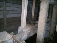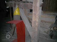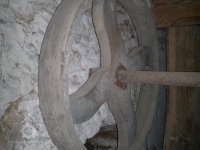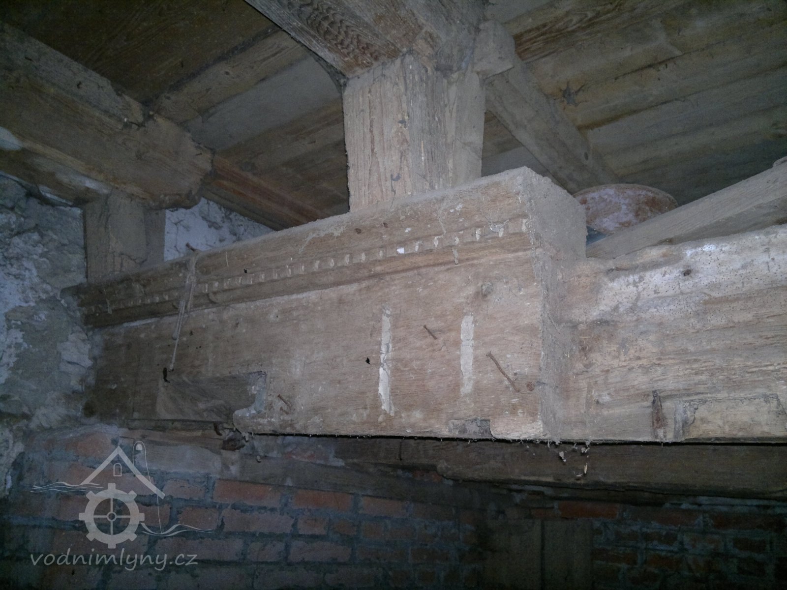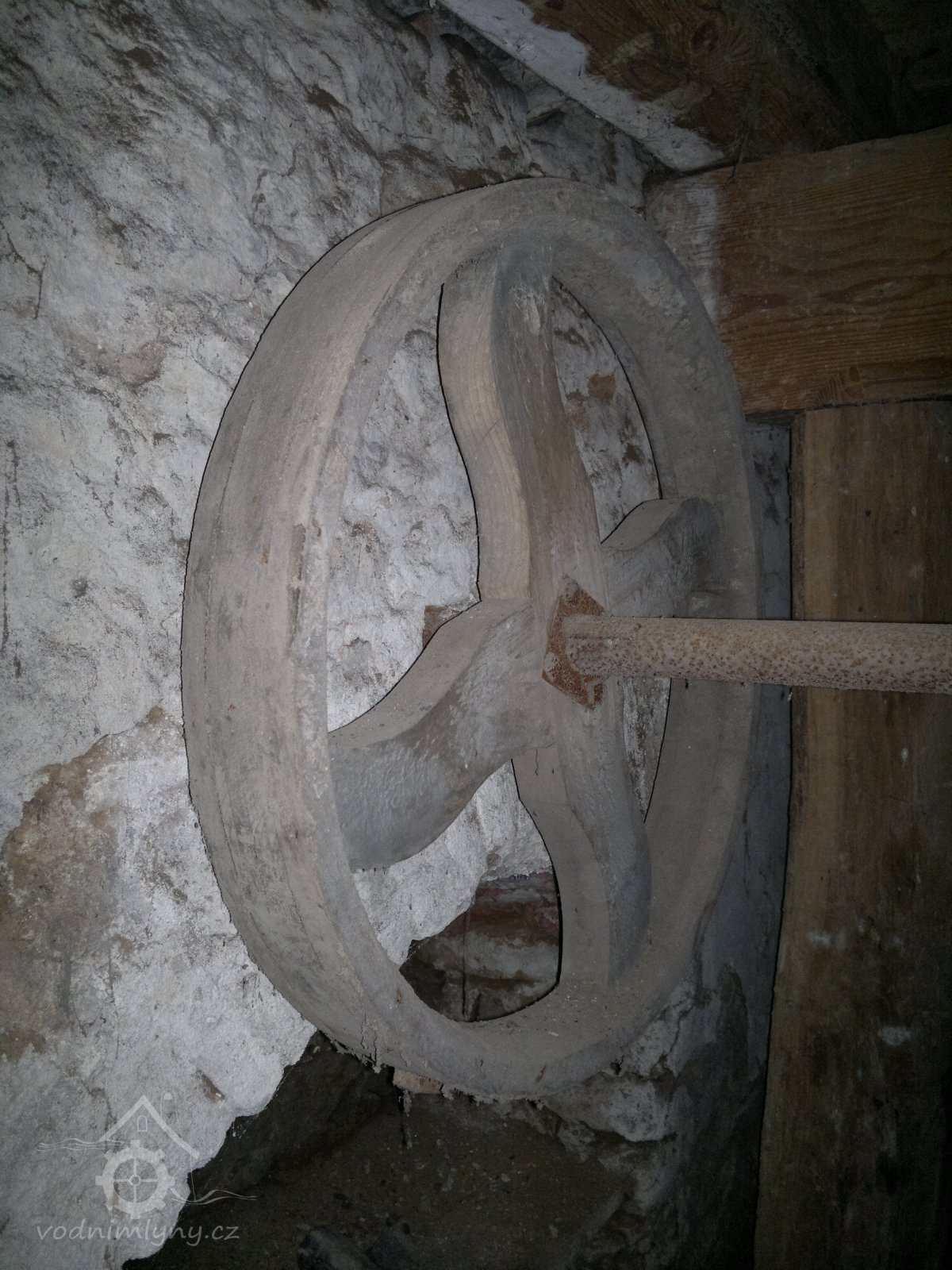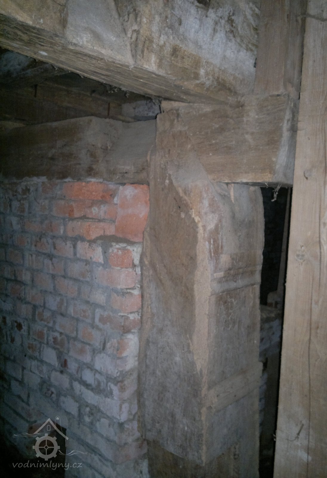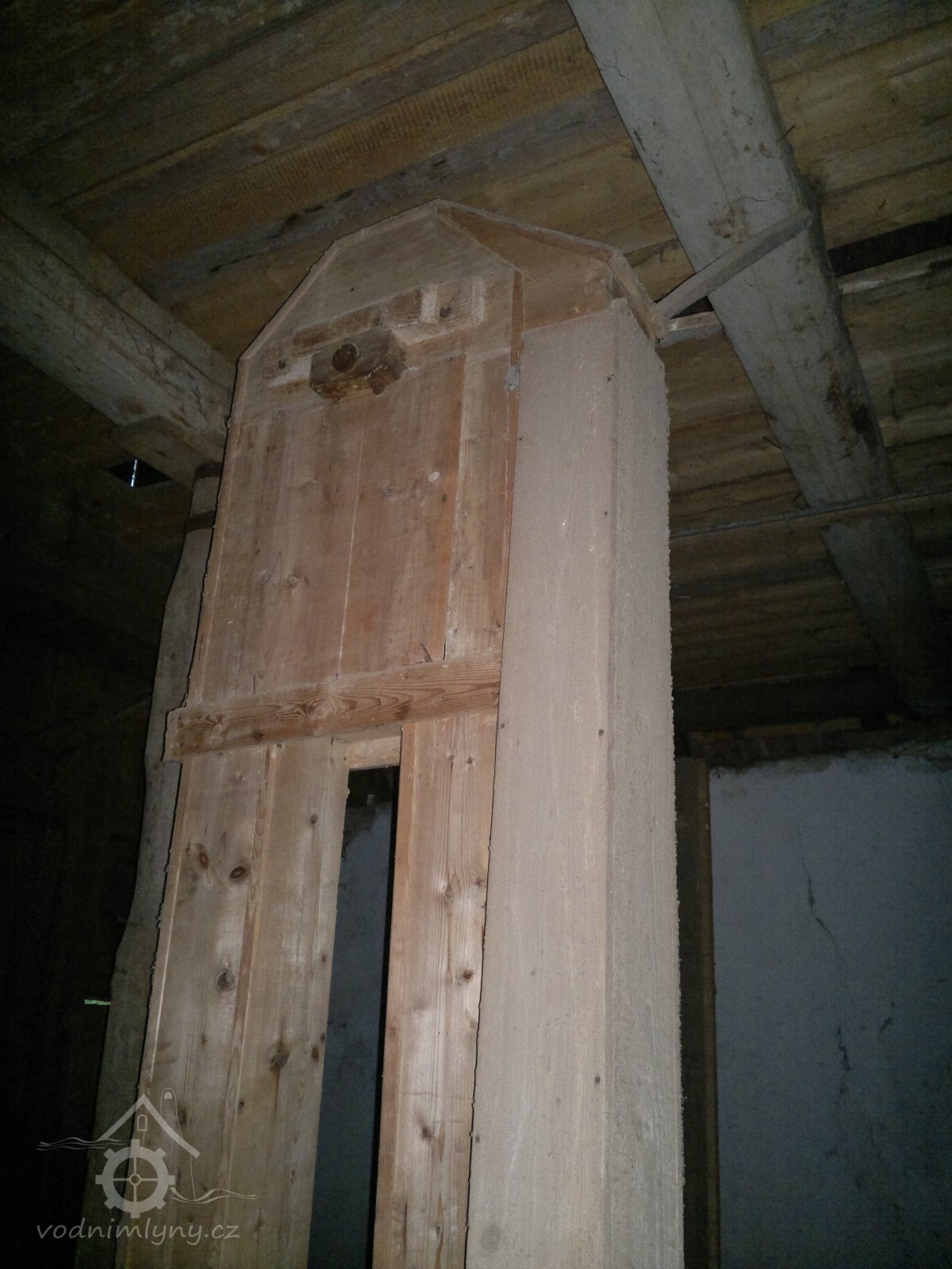 pohon mlecích kamenů - vertikální pohonná hřídel s řemenicí, 2013, © David Veverka, (Prvky na obrázku: transmise, řemenice, převody)