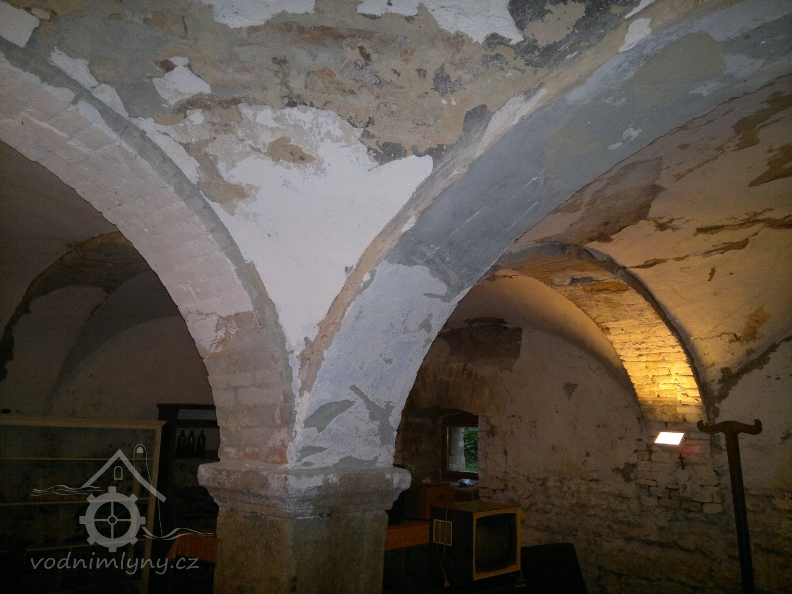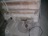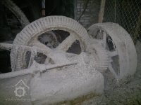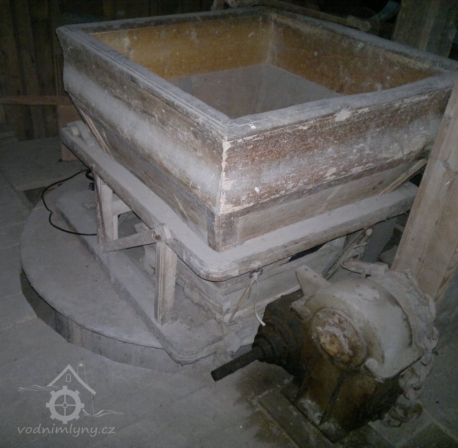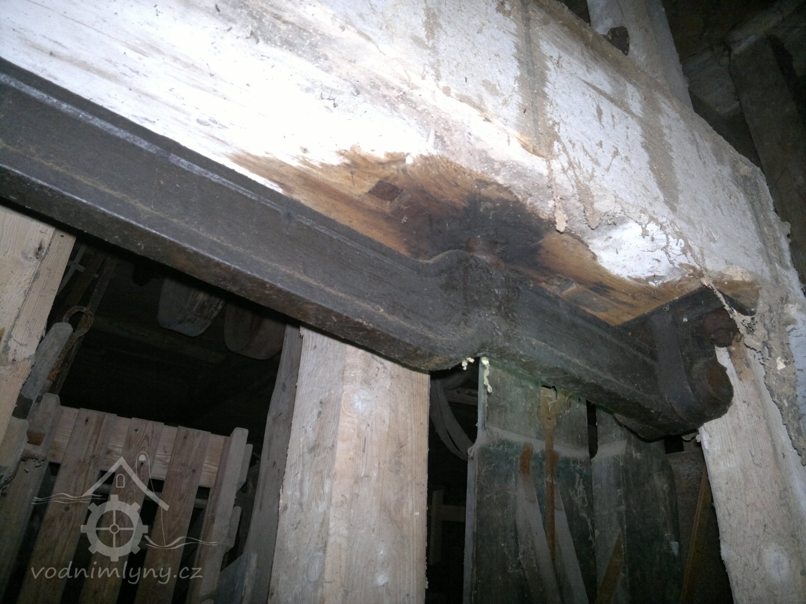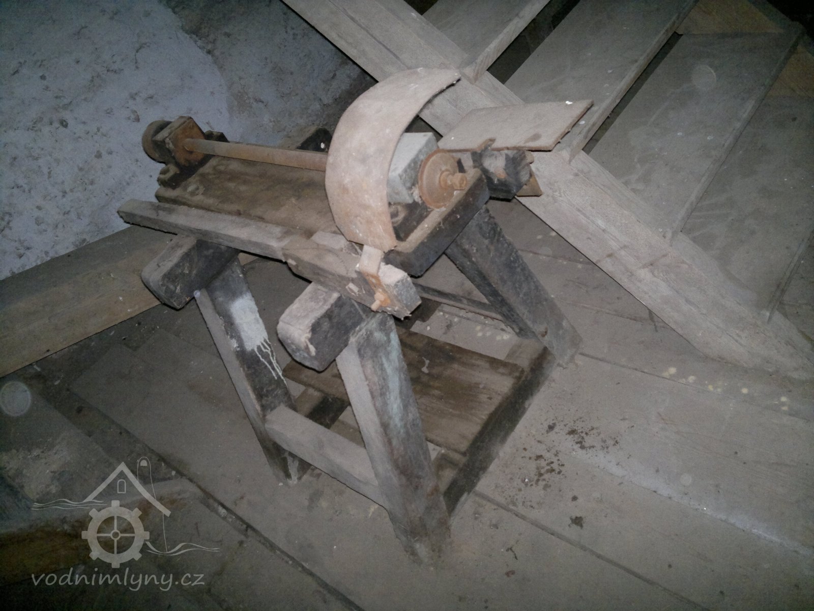 pohon mlecích kamenů - vertikální pohonná hřídel s řemenicí, 2013, © David Veverka, (Prvky na obrázku: transmise, řemenice, převody)
