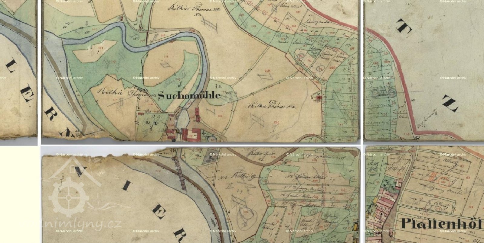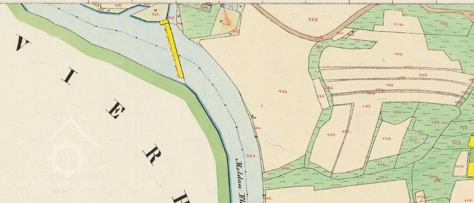 stav Seznam 1930: majitel Felix Hansa, mlýn, turbína 1 Girard + 2x Francis, průtoky 1,805, 2,640, 1,180 m3/s, spád 1,8 a 2m, výkony v HP: 32.5, 50.8, 23.6 (PK)