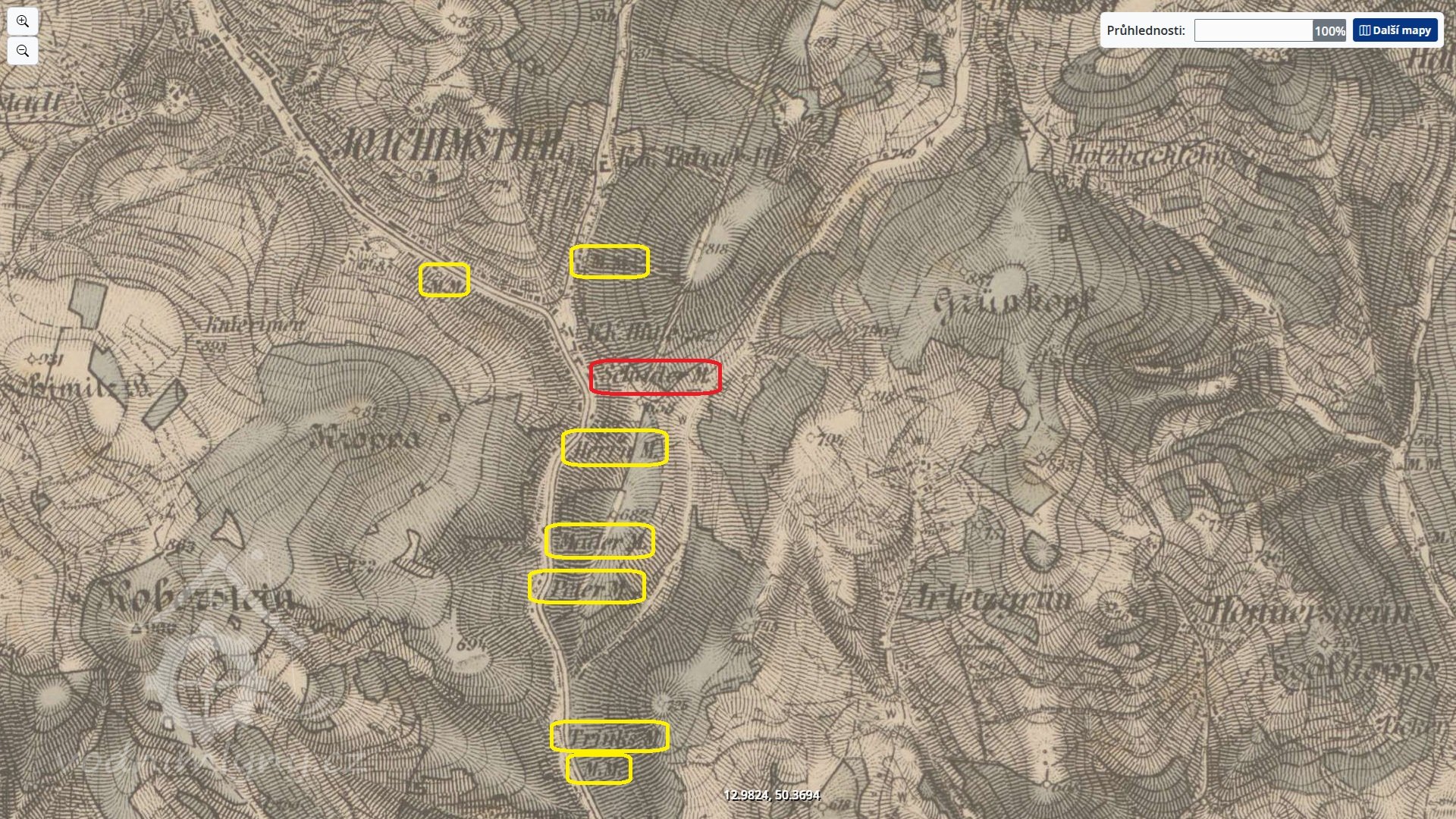 Udržován, i když znešvařen novodobými přestavbami, je bývalý mlýn čp. 412, ležící proti proudu Jáchymovského potoka. Slouží jako opravárenské dílny.