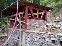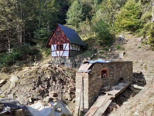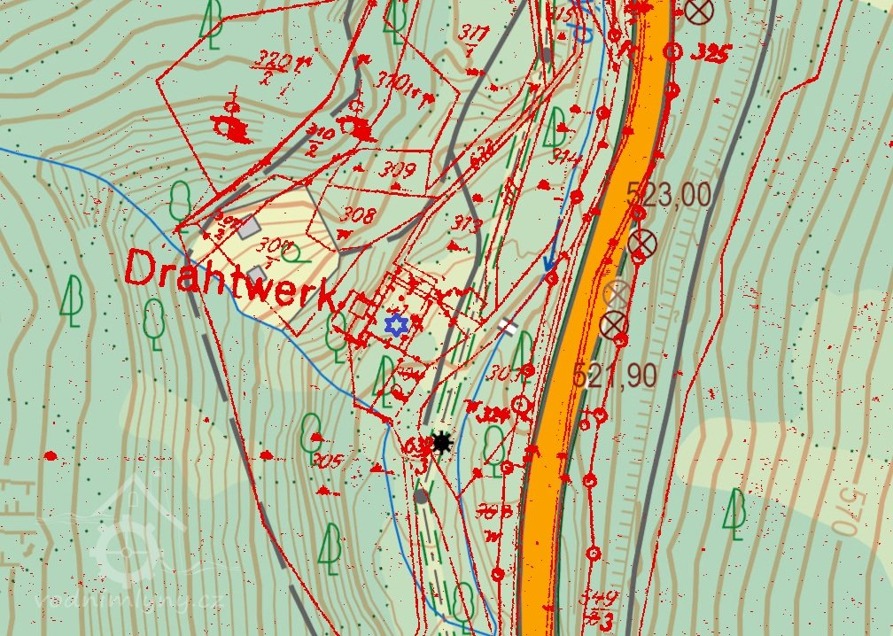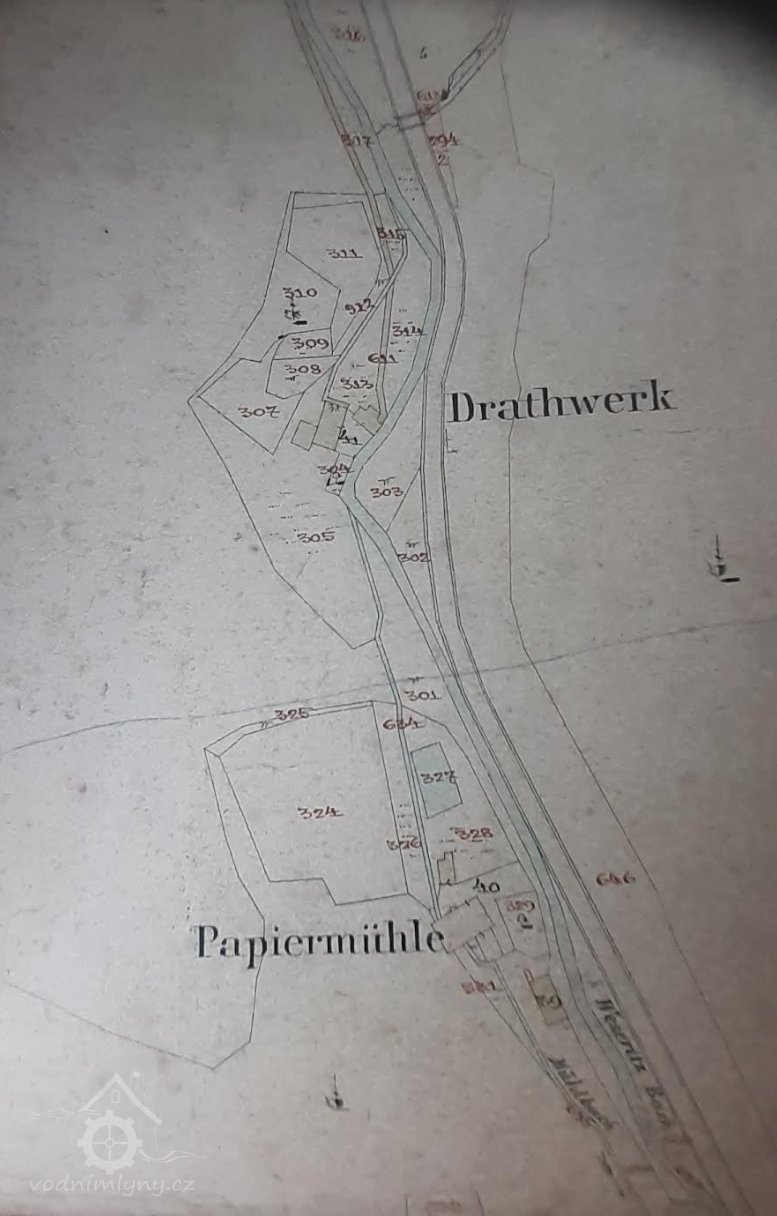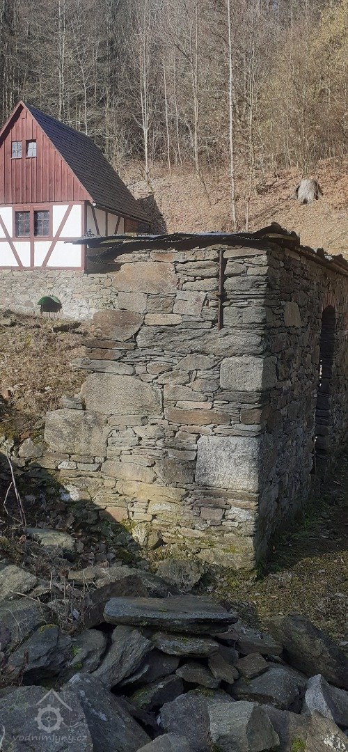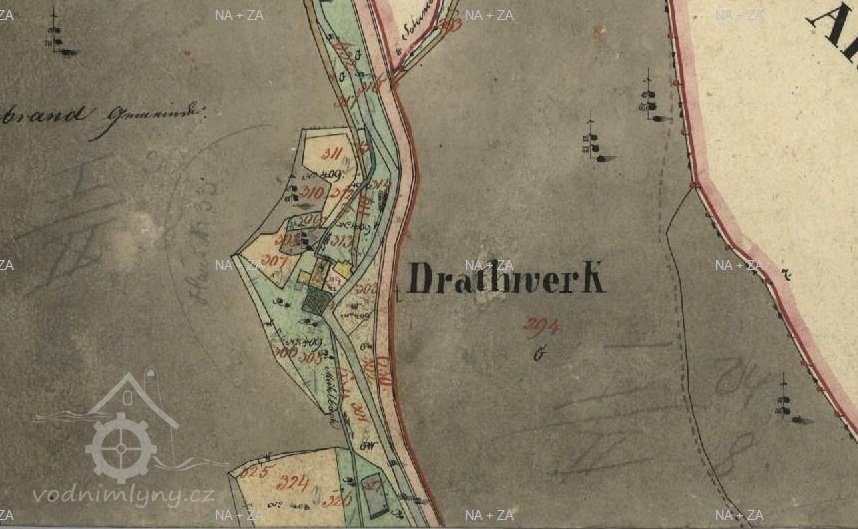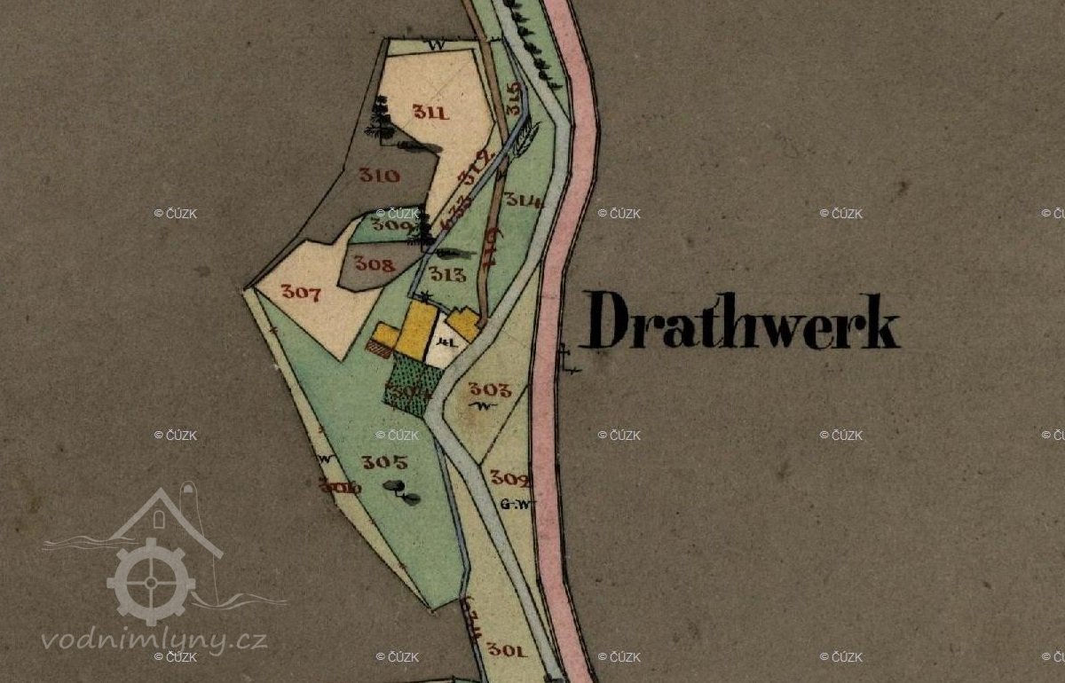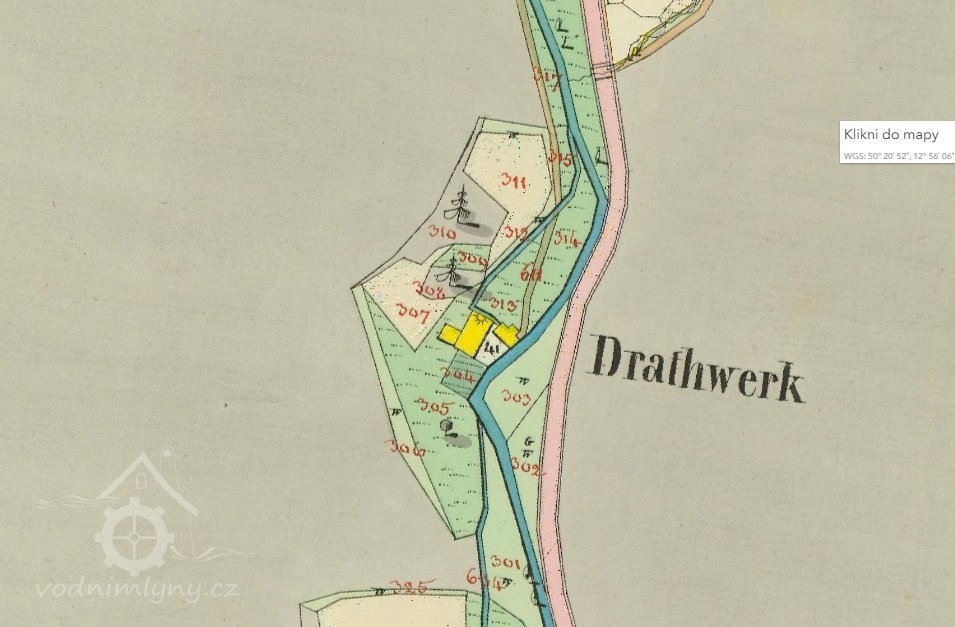 Již léta na místě, které vlastním, znovuobjevuji a zachraňuji bývalý hamr (drahtwerk), který zkujňoval železo na nářadí do dolů, o čemž svědčí nálezy strusky i polotovary. Nejprve tu bývala lehčí hrázděná stavba s dvěma menšími koly, jedno na kladivo a druhé menší pohánělo měch anebo brus. Po skončení hornické činnosti a koncentraci výroby železa se zde postavil kamenný mlýn s jedním kolem na mletí mouky, což je doloženo jak písemně, tak i nálezem mlýnského kamene o průměru 86 cm. Poslední vodní kolo mělo v průměru 5 m a s 180 l průtoku dávalo výkon 7,5 k.s. Vodní kniha 1875 uvádí „moučný mlýn s jedním složením se špičákem a s dvěma vodními koly, vodní právo od nepaměti“. Když došlo k výstavbě uměleckých strojních mlýnů, postavila se zde pila, zbyl po ní betonový blok. Stavební řezivo sloužilo k výstavbě lázní na zač. 20 stol, v té době se všechna funkční vodní díla v údolí přebudovala na pily.