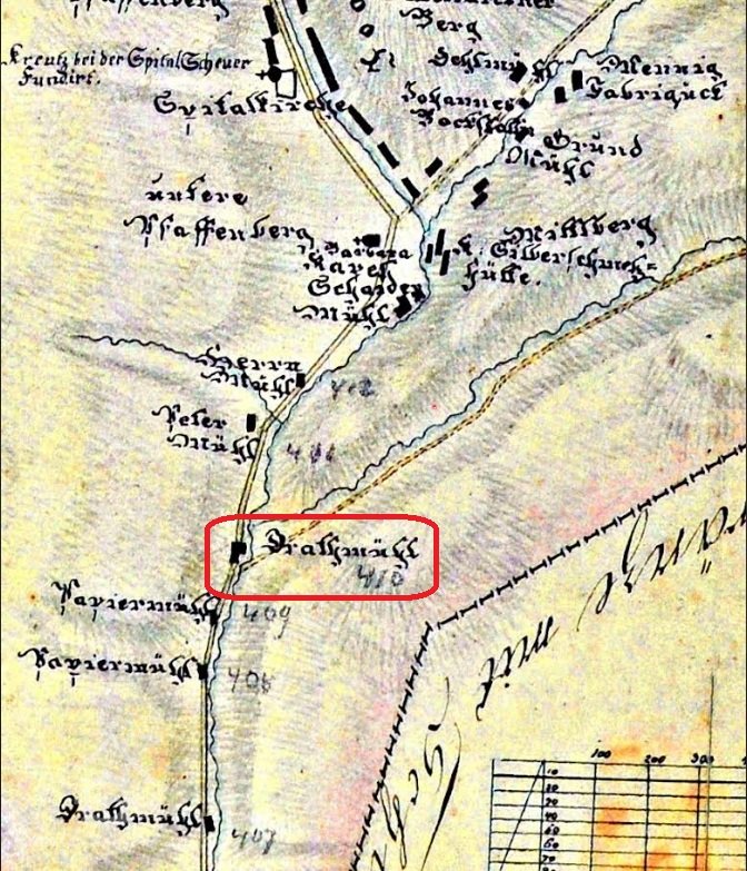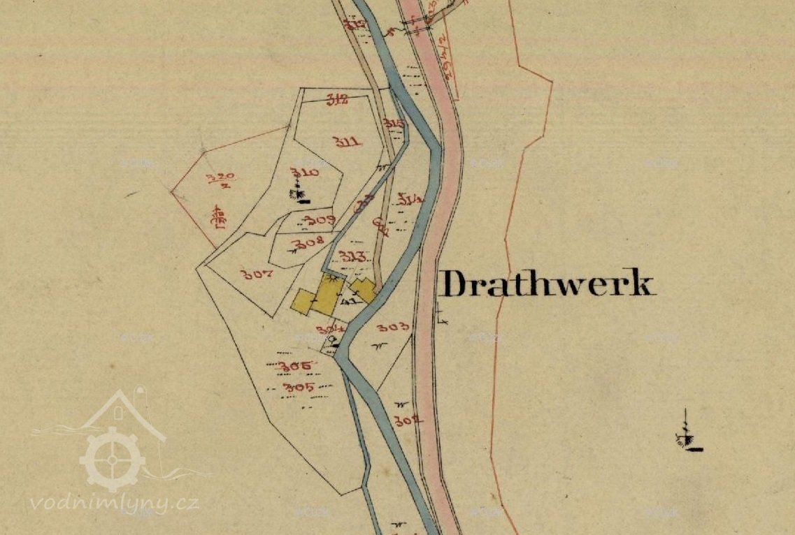 Na mapě Chebského kraje z roku 1715 je mlýn ještě označen jako obilný mlýn. Na mapě z roku 1742 Thermas Carolinas je již mlýn označen jako drátovna s odlišným symbolem mlýnského kola. V kronice města se zhruba do roku 1720 hovoří o mlýnech. Po tomto datu již kronika výslovně hovoří o mlýnech, papírnách, drátovnách. Jinak tento mlýn společně s dalšími v oblasti zvané Mühlengrünn (později Mühlenthal) patřil společně s Horním Žďárem městu Jáchymov.