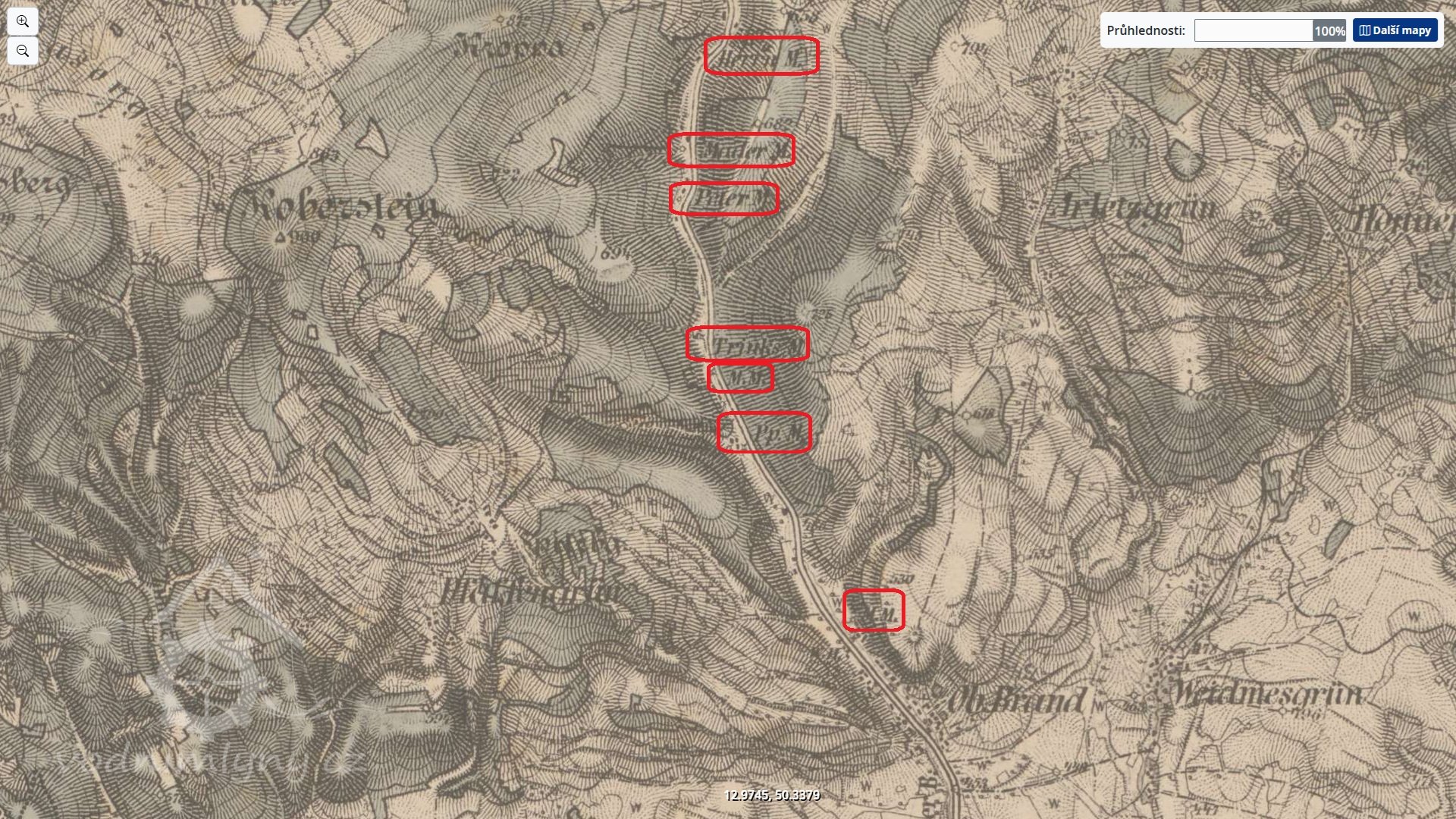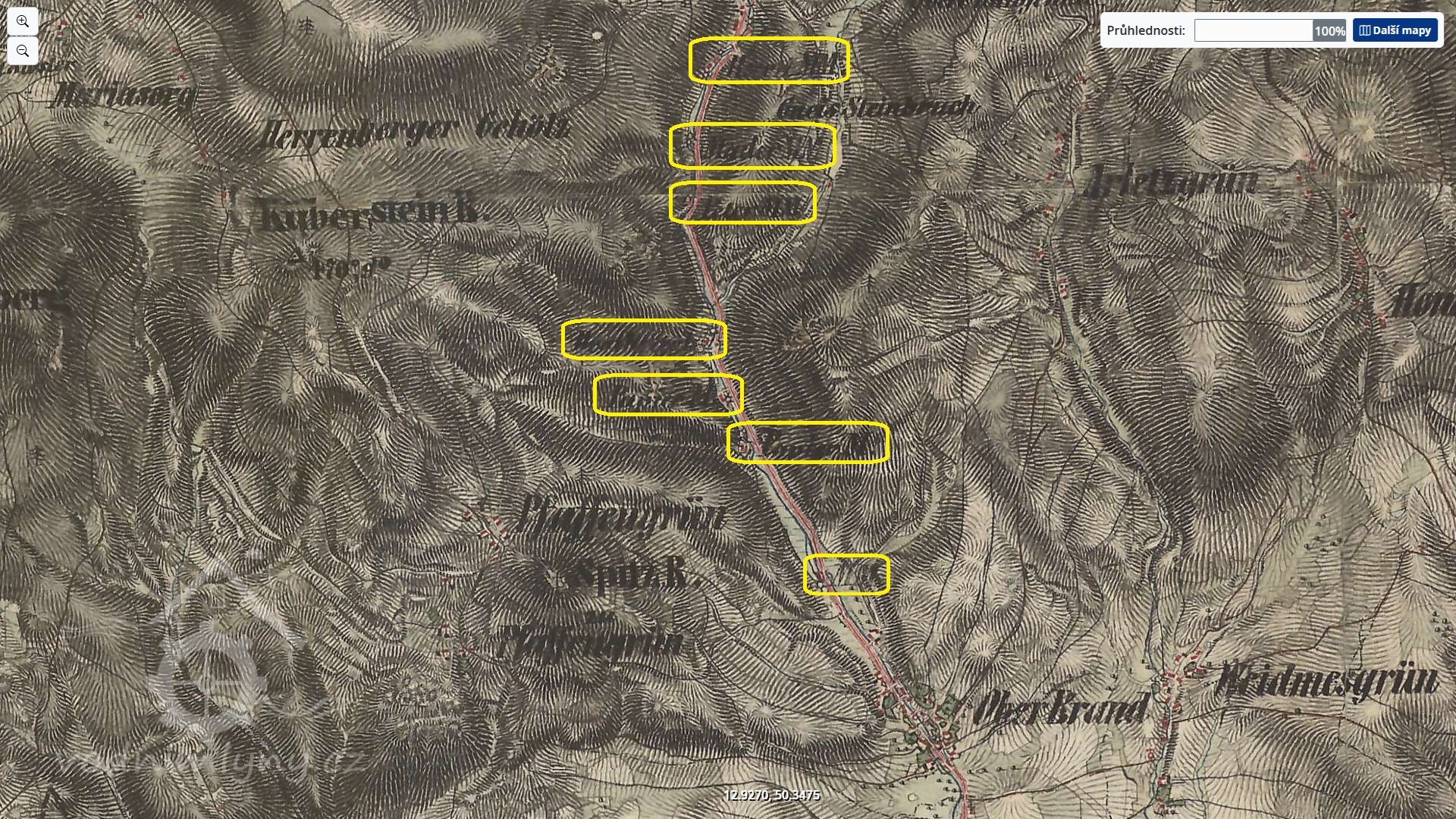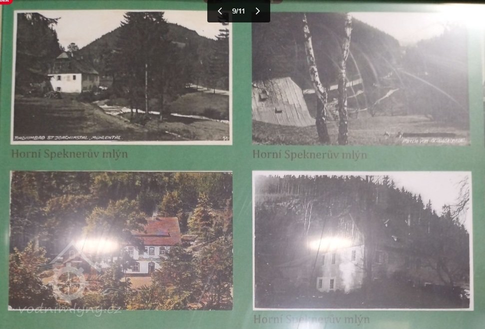 Obere Speknermühle (Horní Speknerův mlýn). Původně železný hamr, přestavěný pro nedostatek rudy na obilný (moučný) mlýn s pilou. Takto je značen na mapě Chebského kraje z roku 1715. Na mapě Thermas Carolinas z roku 1742 je již značen jako drátovna. Také kronika Jáchymova do roku 1720 hovoří o mlýnu, po tomto roce již o drátovně. V roce 1922 se stal nájemcem Josef Wondraschek a ten zde zavedl výrobu šindelů. Mlýn disponoval pětimetrovým kolem a během II. sv. války sloužil jako obytný dům. Po válce zůstal neobydlen a nakonec byl pro zchátralost stržen. Na jeho místě byla později postavena malá vodní elektrárna.