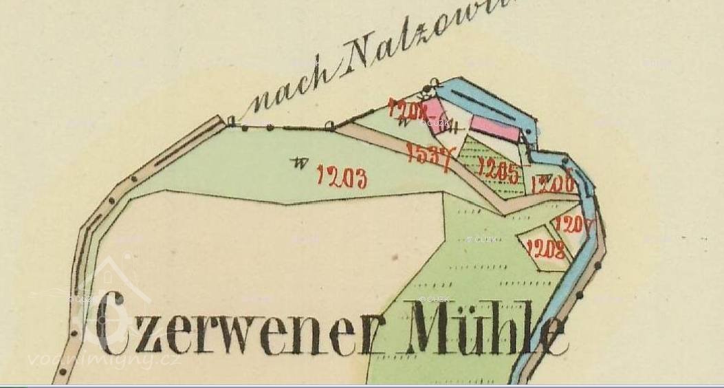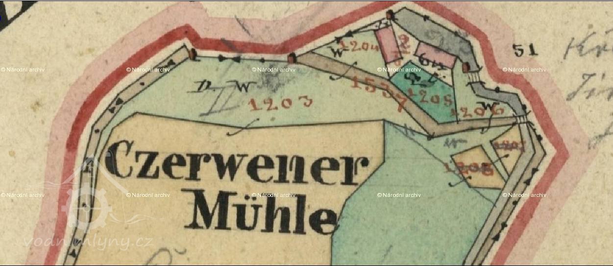Mezi rybníkem Musíkem a obcí Chlum v katastru obce Dublovic ležel v osadě Červený mlýn s číslem popisným 92. Tomuto poddanskému mlýnu, ke kterému vedl kilometrový náhon z potoka Musíku, se odedávna říkalo „Na Červeném“ nebo pouze „Červený.“ Vodní cejch byl zasazen 18. srpna 1881. Takovéto události se běžně účastnil starosta, zástupce obce představenstva, stavební rada, okresní komisař, nestranný technický znalec, horní a dolní mlynář a bezpochyby majitel mlýna. Tím byl tehdy Jan Jiráček, neboť fix nese jeho iniciály JJ. Od roku 1898 vlastnil mlýn Alois Jiráček.