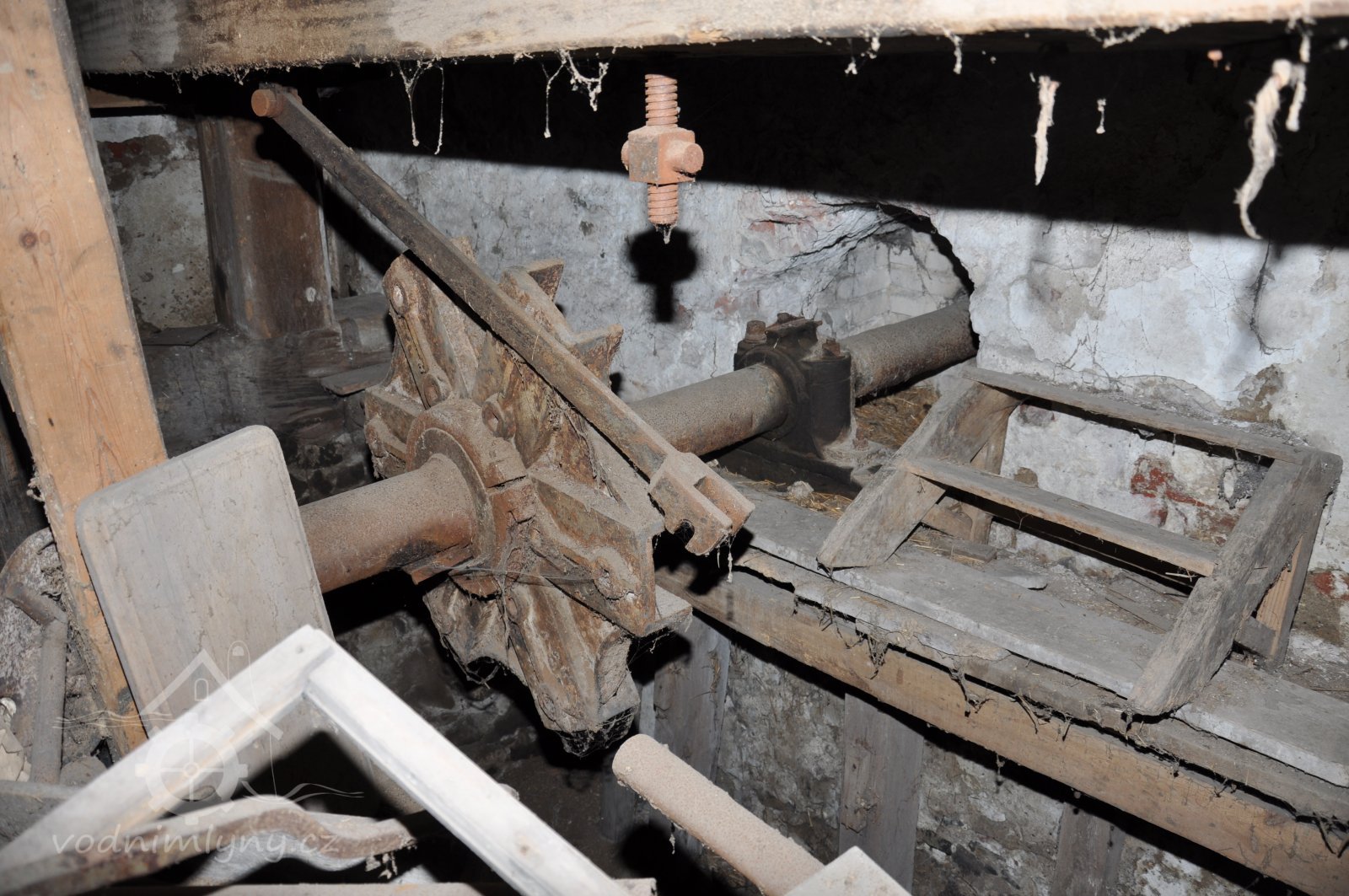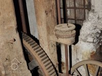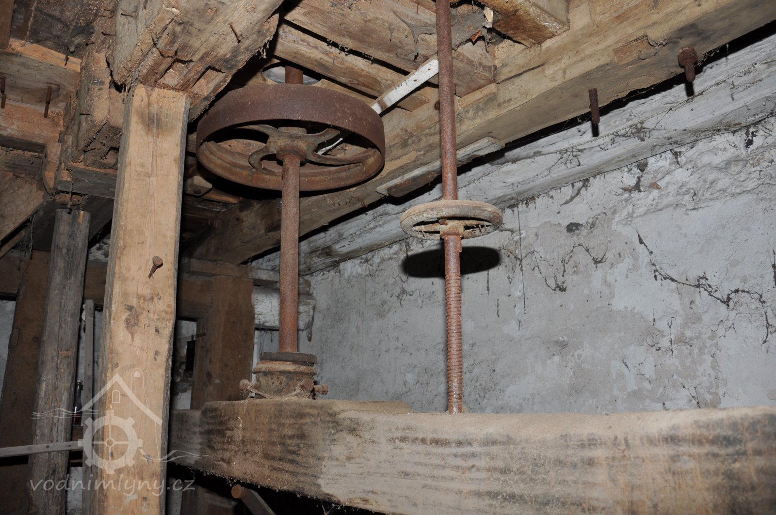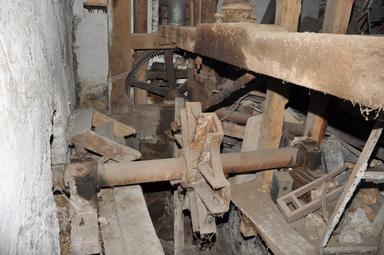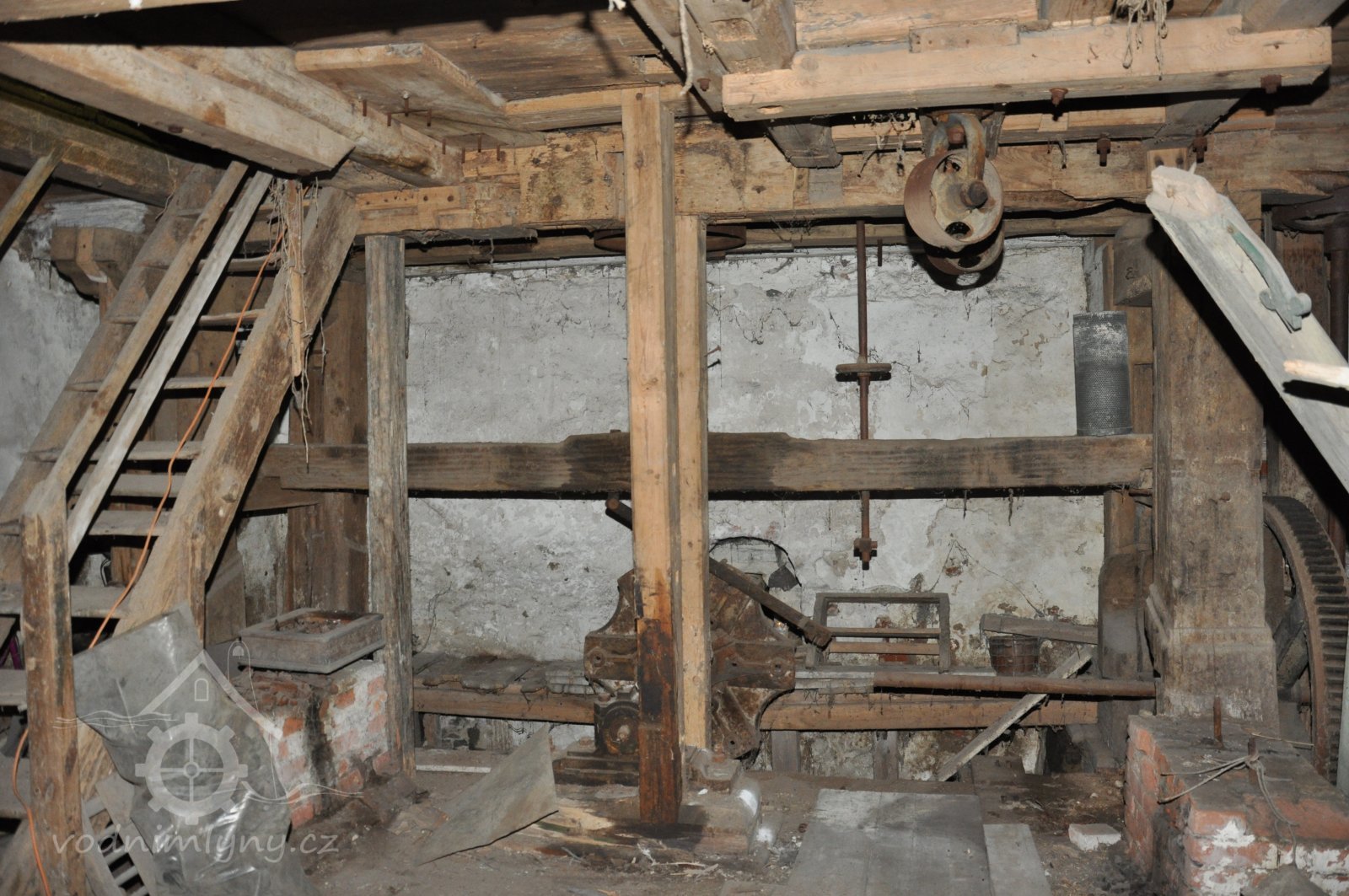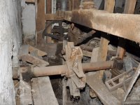 pohled do přízemí - spodních prostor mlýnice tzv. podkolí, 2015, © David Veverka, (Prvky na obrázku: transmise, řemenice, převody, mlýnská hranice)