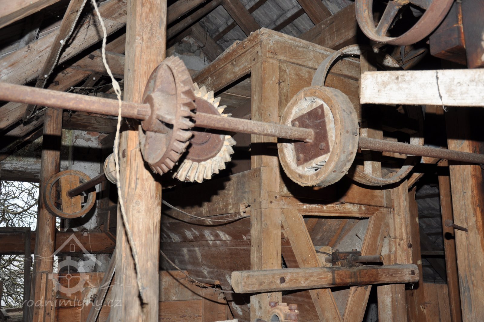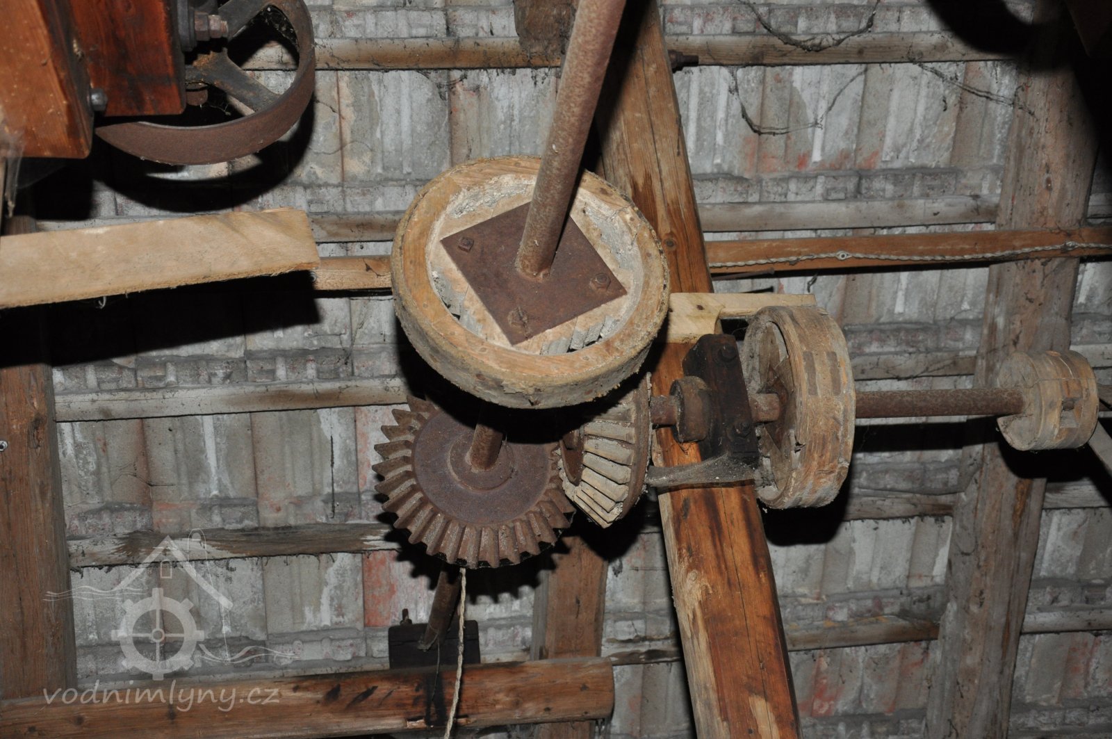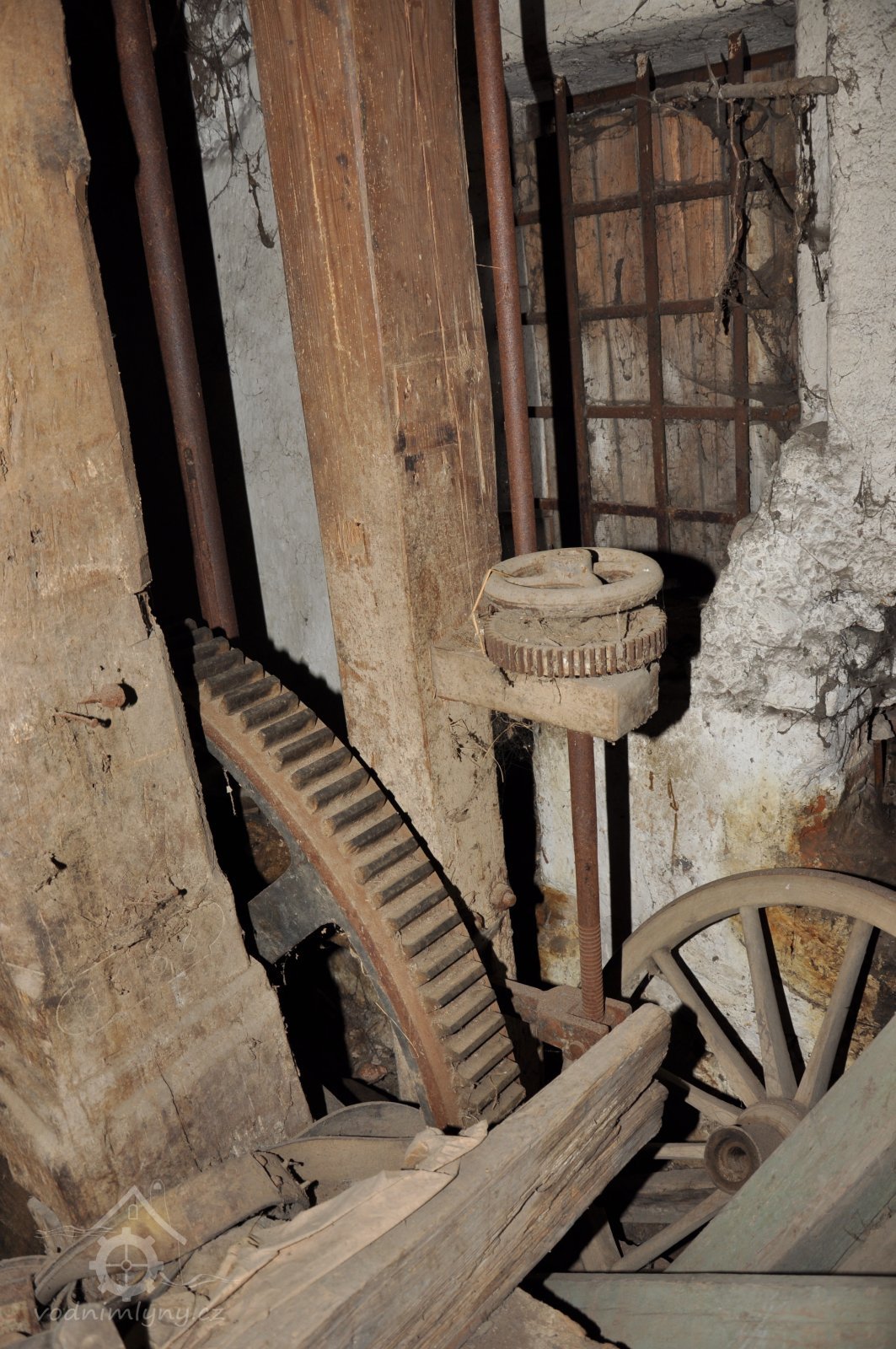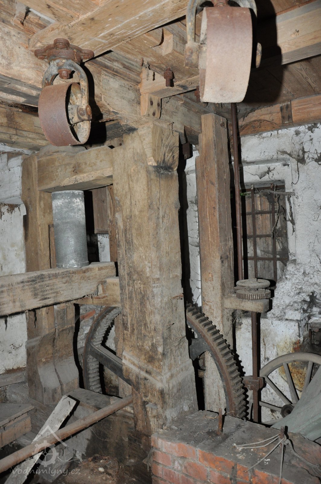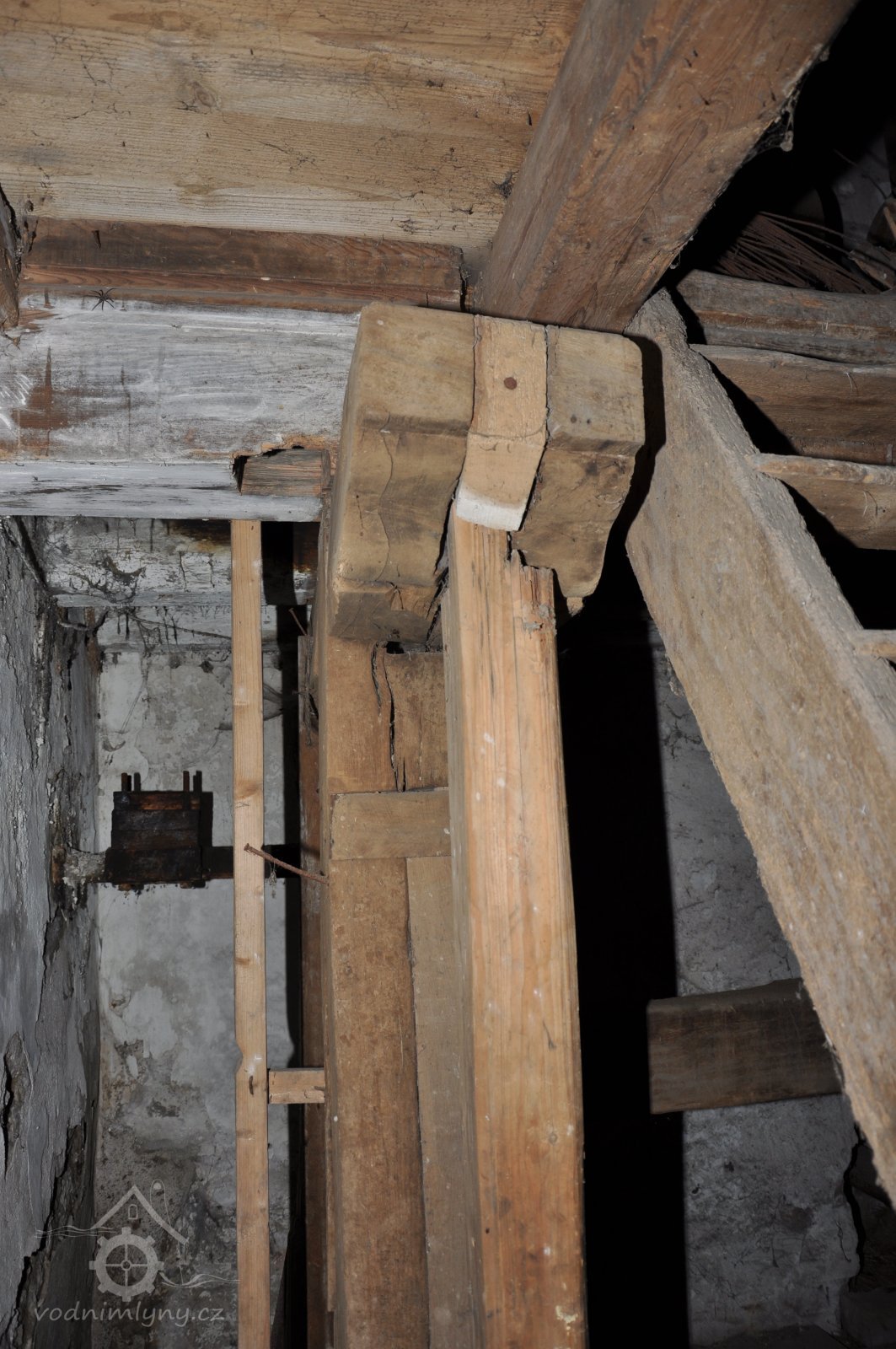 pohled do přízemí - spodních prostor mlýnice tzv. podkolí, 2015, © David Veverka, (Prvky na obrázku: transmise, řemenice, převody, mlýnská hranice)
