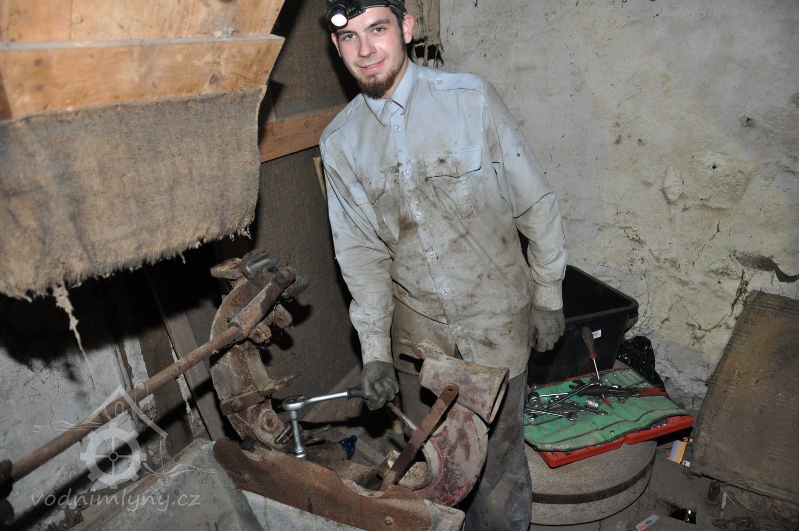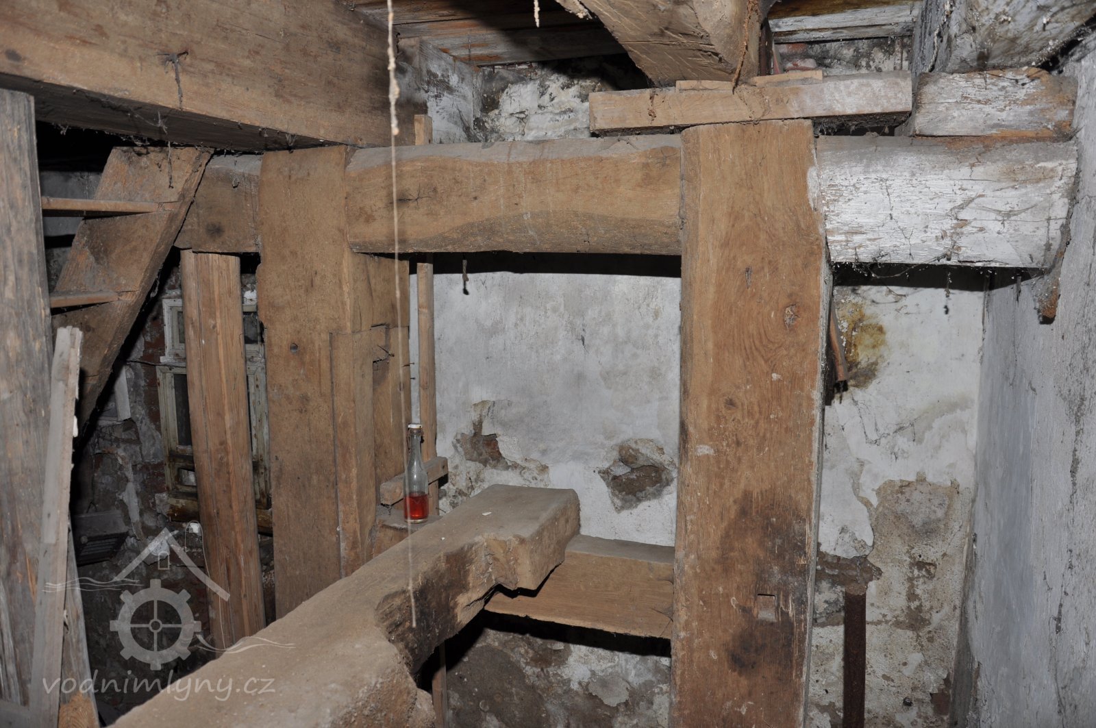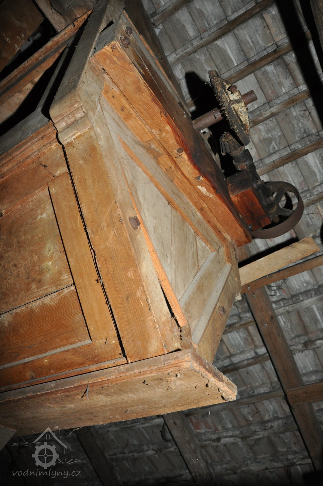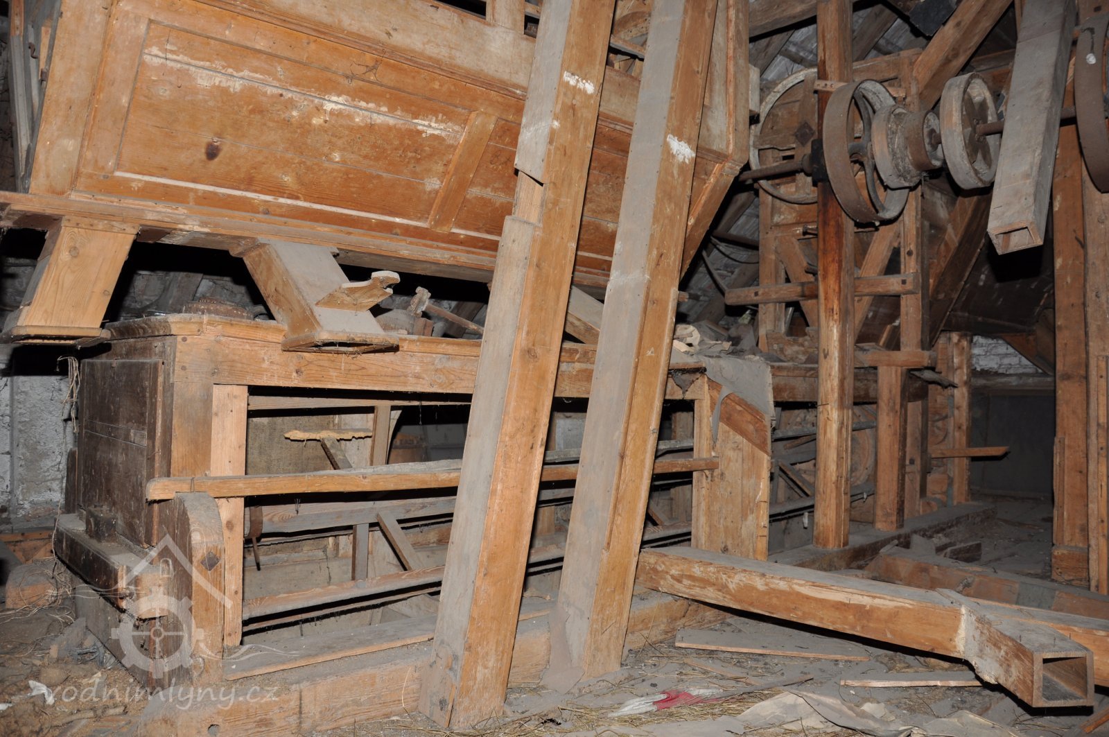 pohled do přízemí - spodních prostor mlýnice tzv. podkolí, 2015, © David Veverka, (Prvky na obrázku: transmise, řemenice, převody, mlýnská hranice)
