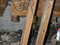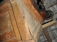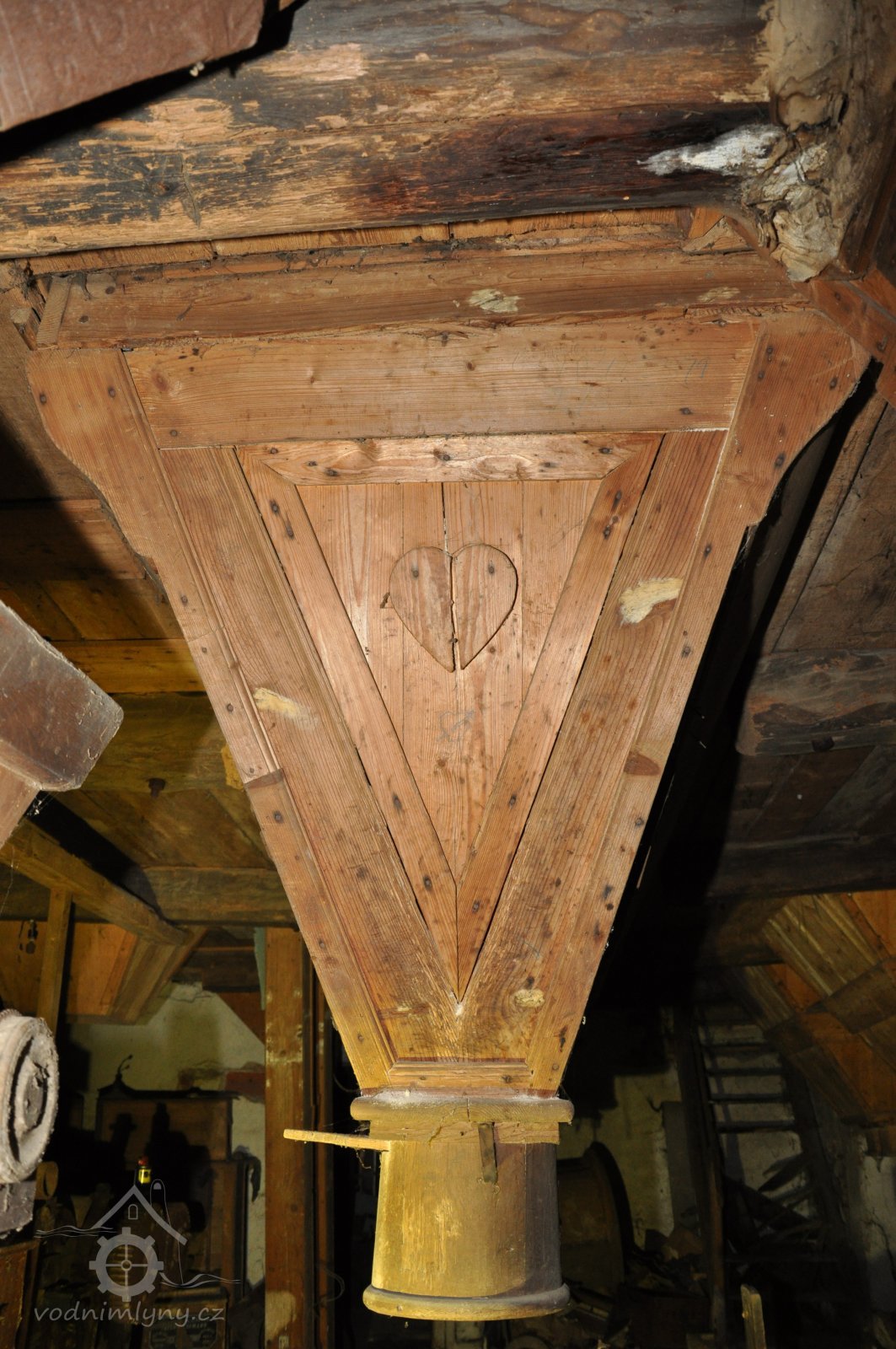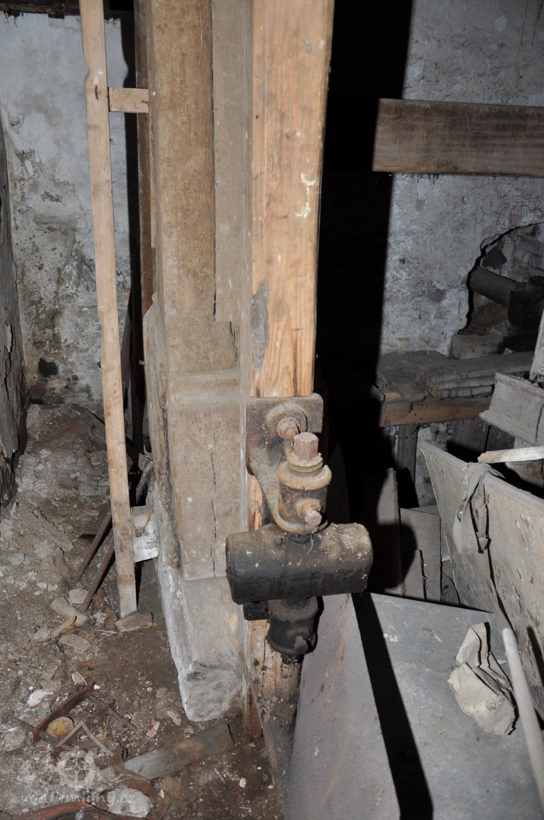 jeden ze sloupů mlýnské hranice a pozůstatek po spodní transmisi - kluzné ložisko konzolové s kroužkovým mazáním, 2015, © David Veverka, (Prvky na obrázku: transmise, řemenice, převody, mlýnská hranice)