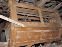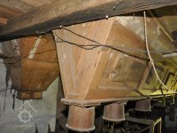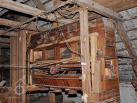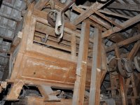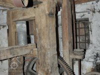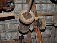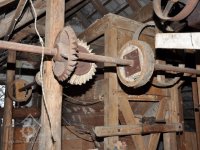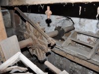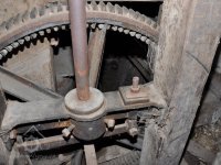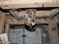 detail zajímavé regulace (lehčení) 2. kamenného složení a paleční převod předlohový bez dochované transmise, 2015, © David Veverka, (Prvky na obrázku: transmise, řemenice, převody, regulátor)