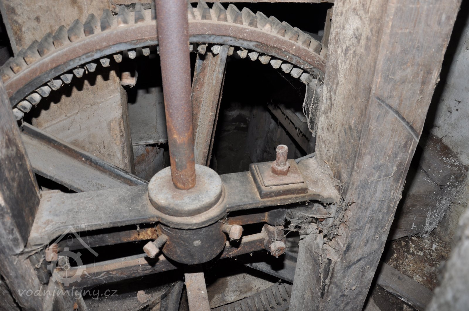 litinový disk rozety palečního kola a ocelová hřídel jdoucí od vodního kola, 2015, © David Veverka, (Prvky na obrázku: transmise, řemenice, převody)