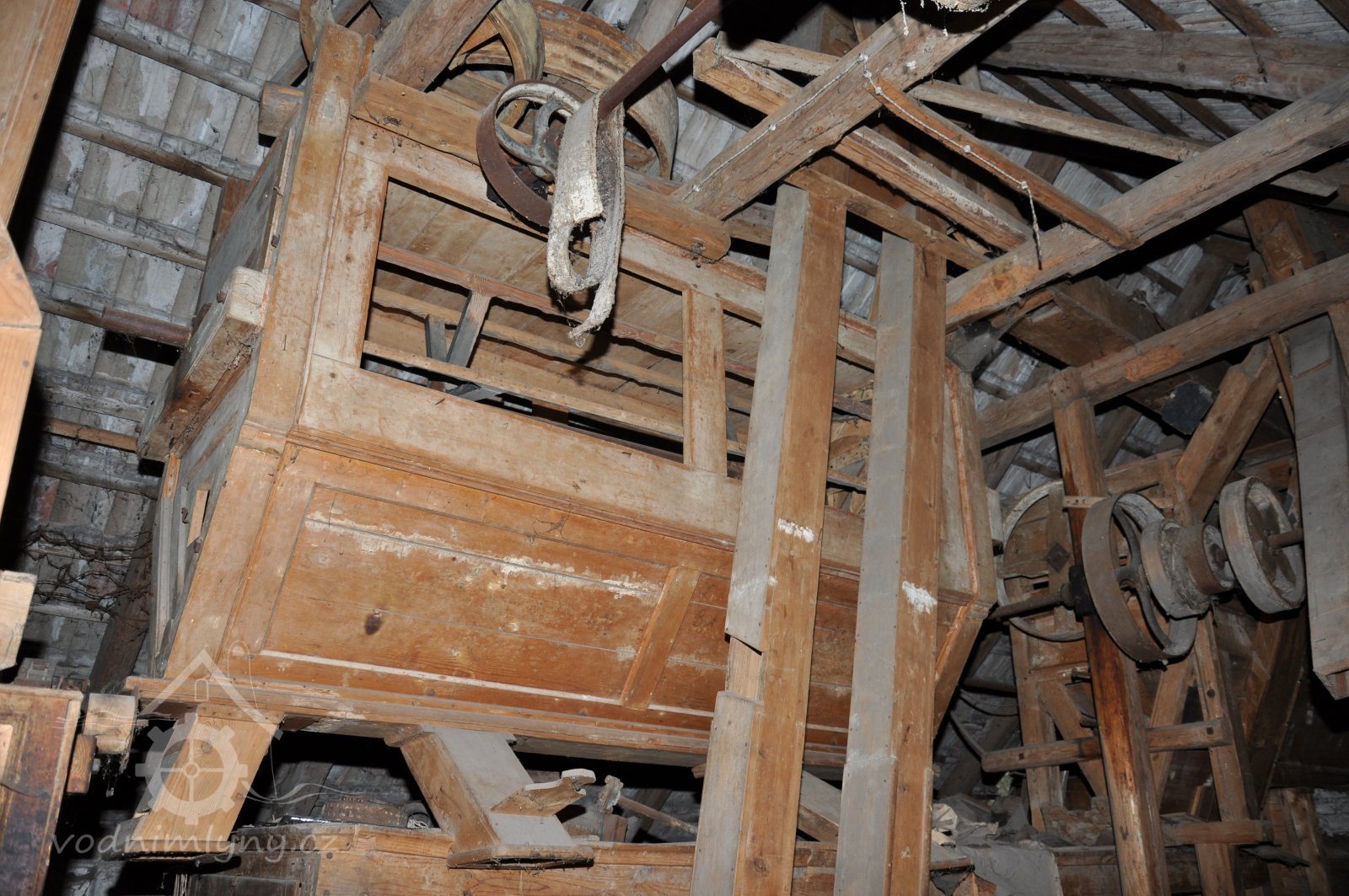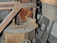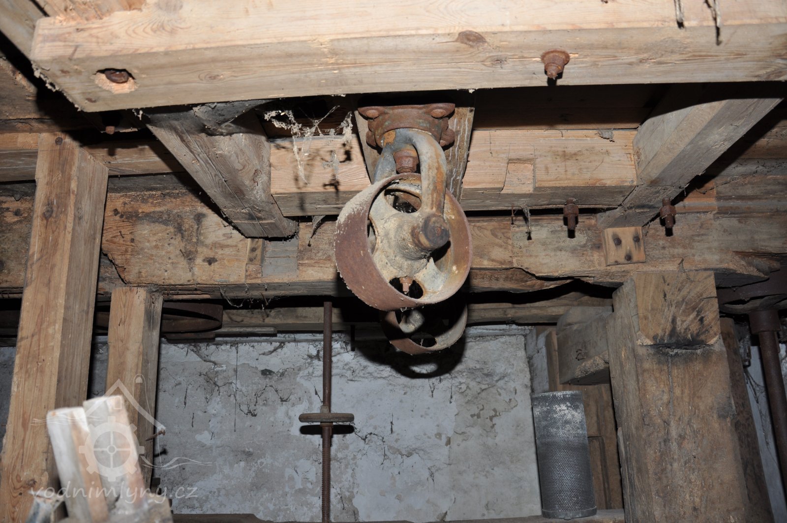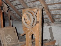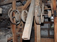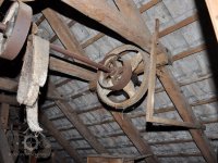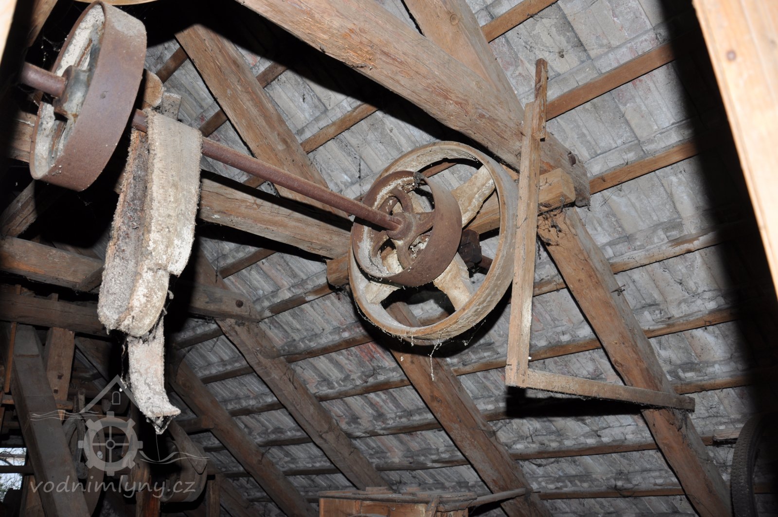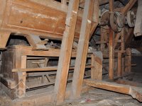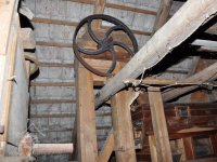 vodící rolny polozkříženého řemenového převodu k pohonu 1. kamenného mlecího složení, 2015, © David Veverka, (Prvky na obrázku: transmise, řemenice, převody)
