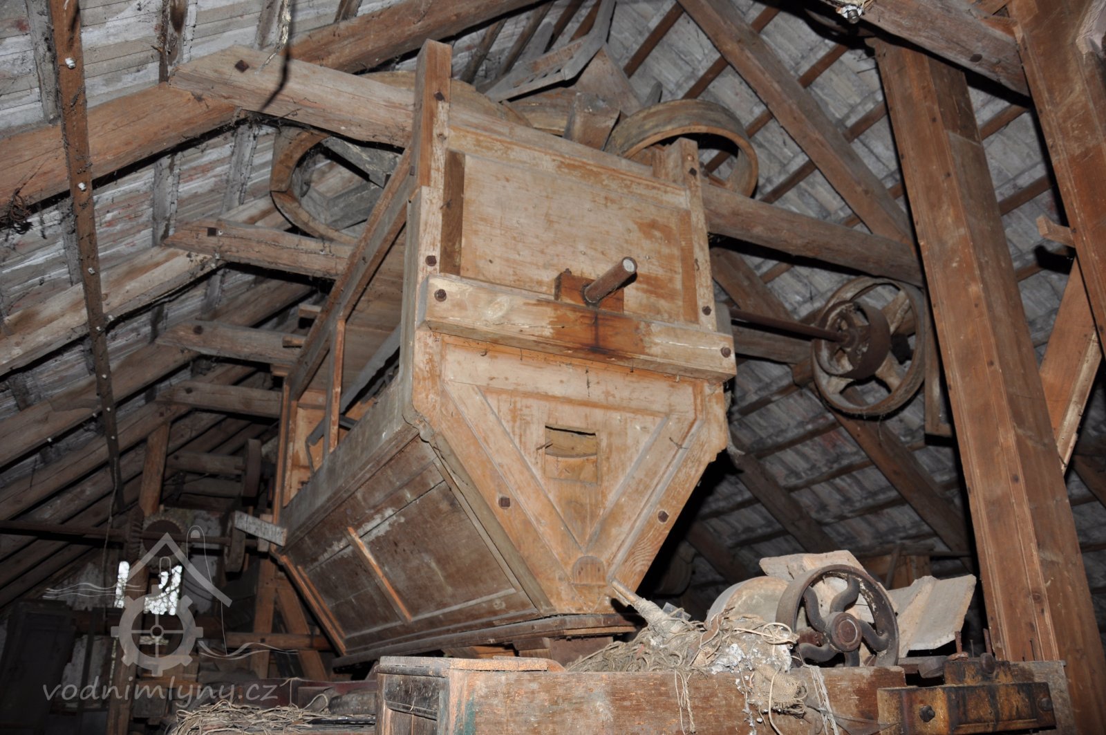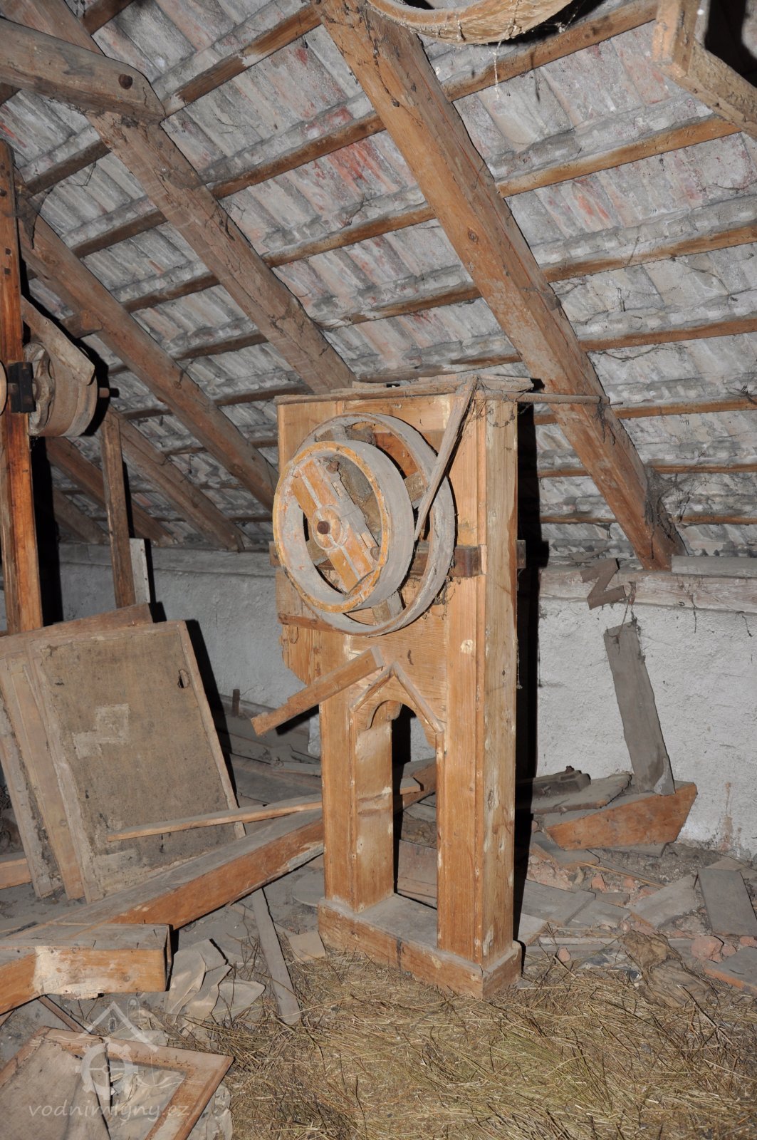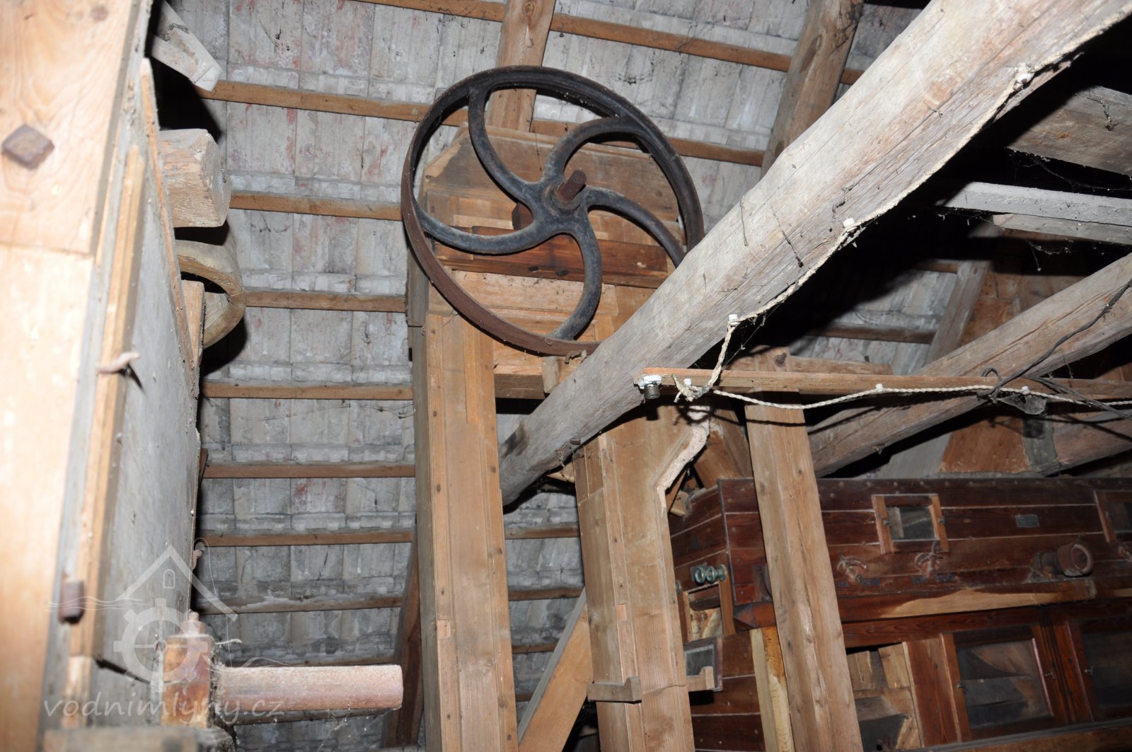 vodící rolny polozkříženého řemenového převodu k pohonu 1. kamenného mlecího složení, 2015, © David Veverka, (Prvky na obrázku: transmise, řemenice, převody)