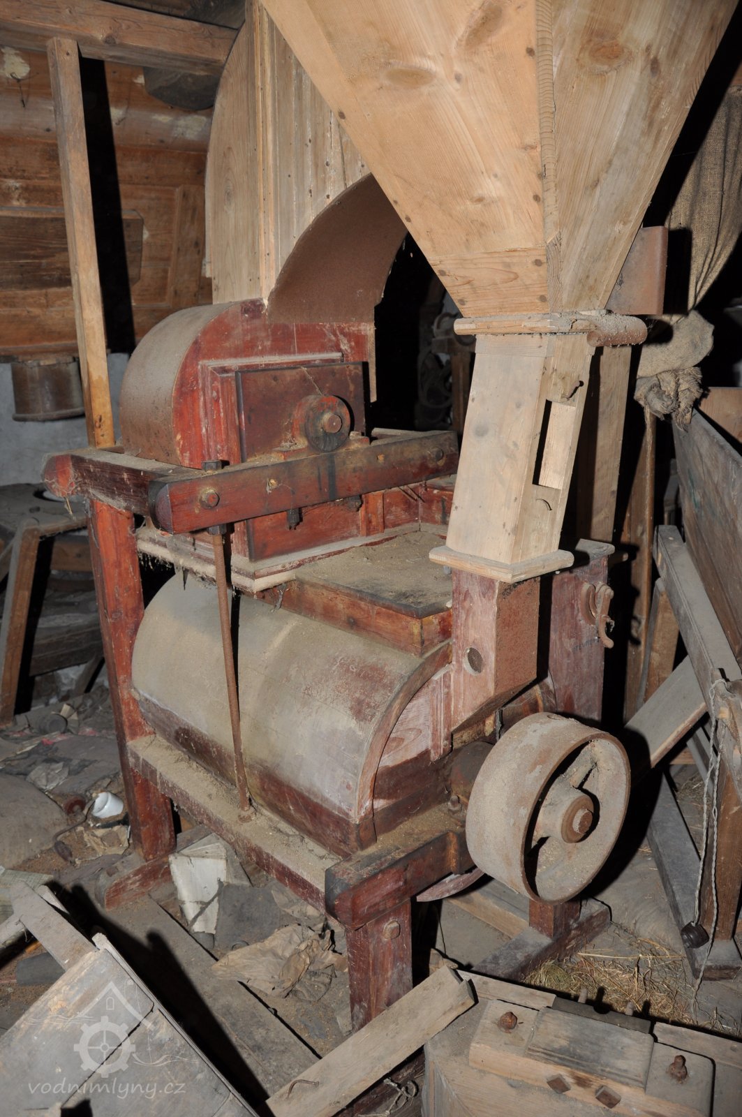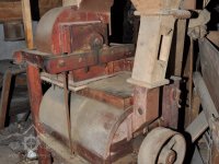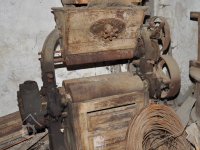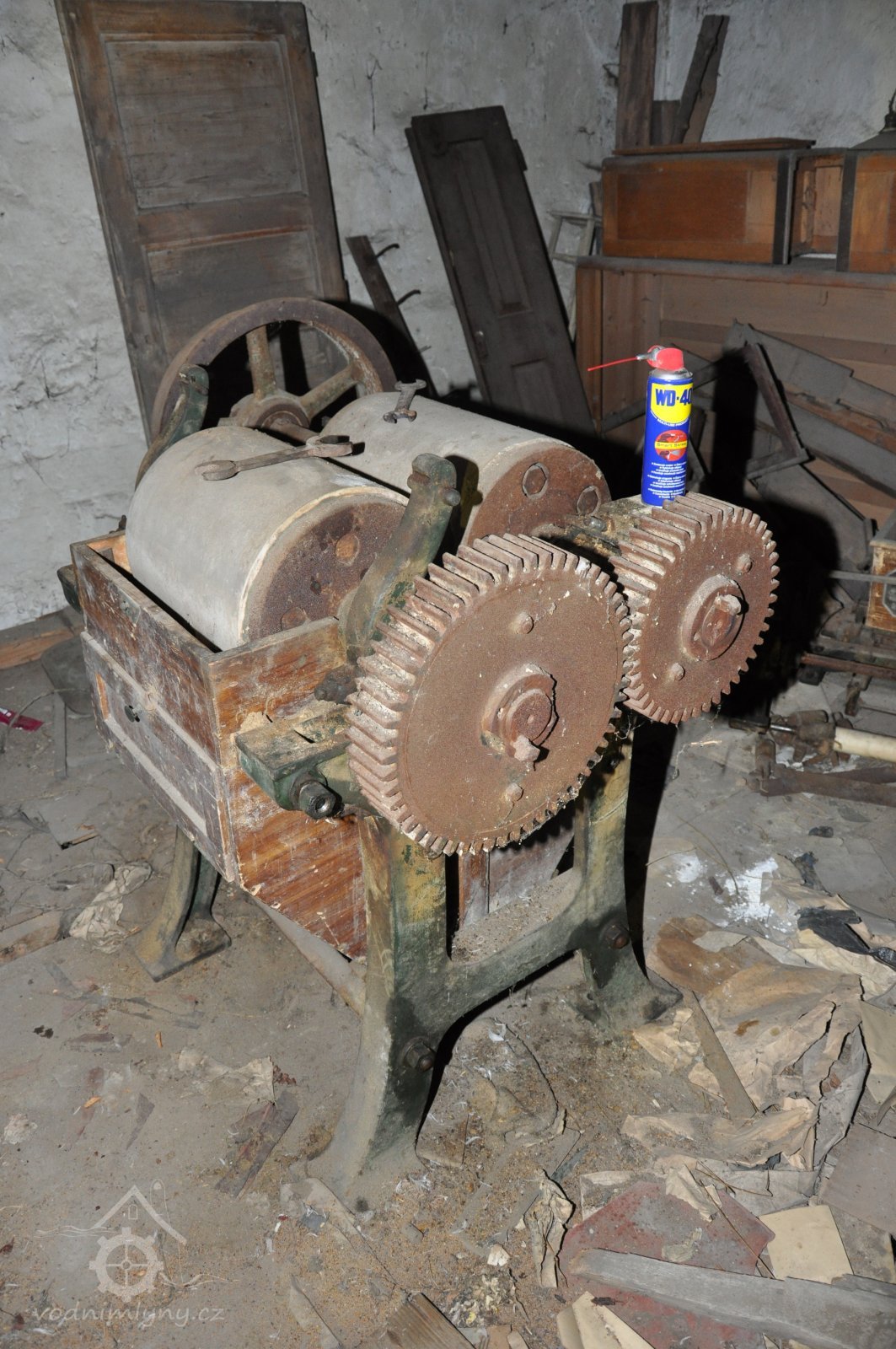 válcová stolice s rýhovanými válci v litinové skříni s plechovým krytem od výrobce Julius Škrlandt – České Budějovice, vyrobená kolem roku 1898, 2015, © David Veverka, (Prvky na obrázku: válcová stolice)