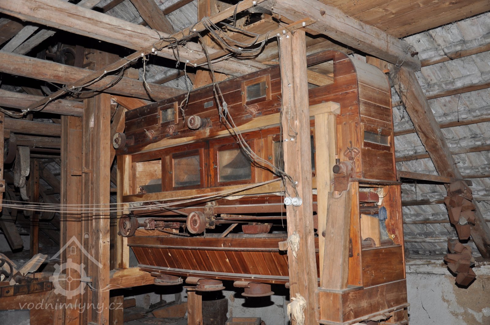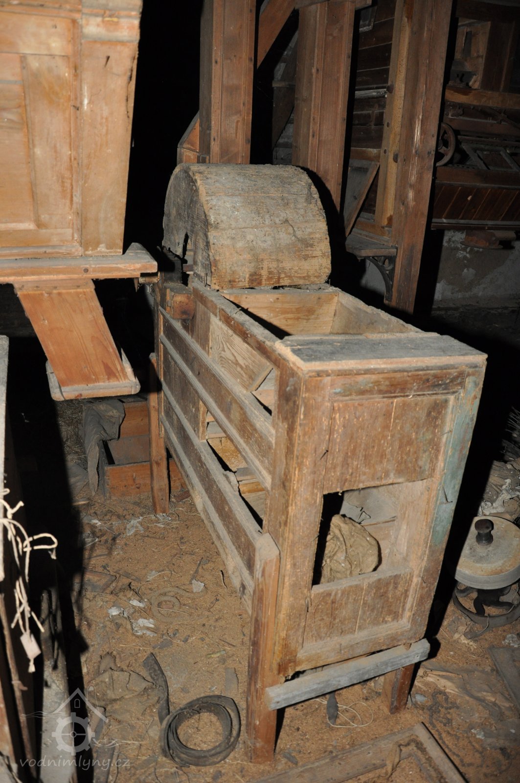 válcová stolice s rýhovanými válci v dřevěné skříni od výrobce J. Kohout – Praha Smíchov, vyrobená po roce 1888, 2015, © David Veverka, (Prvky na obrázku: válcová stolice)