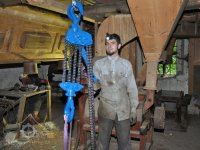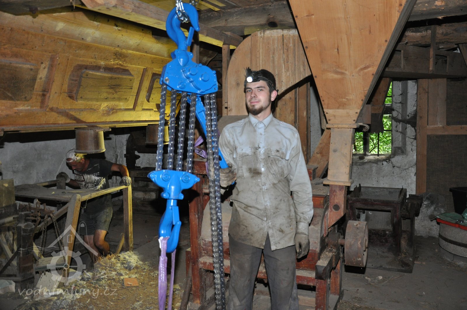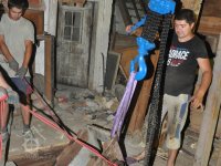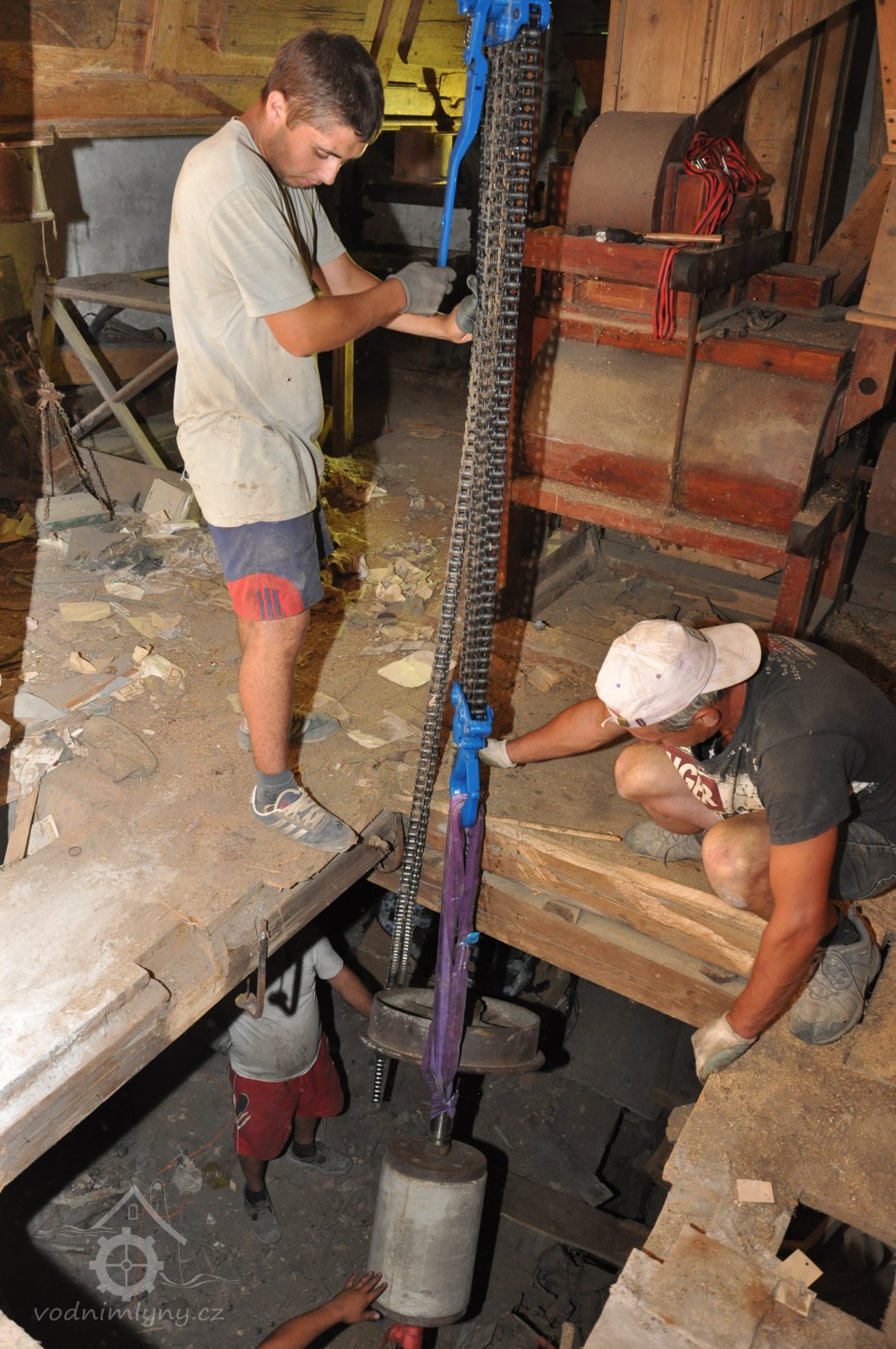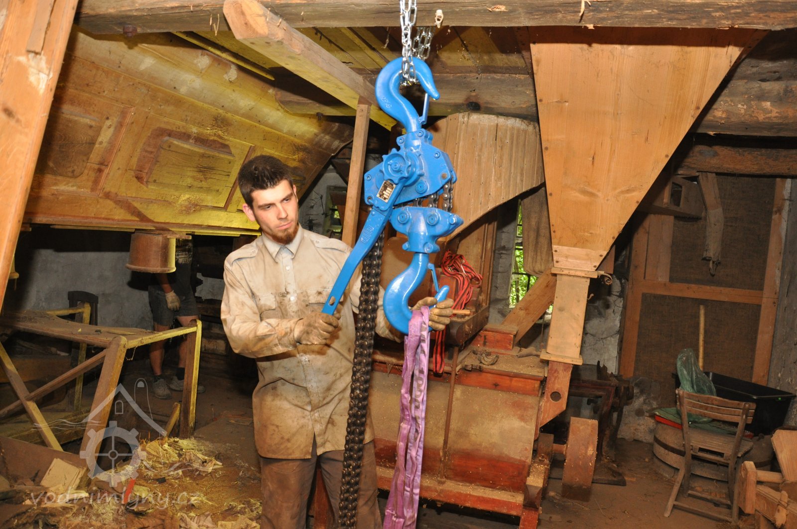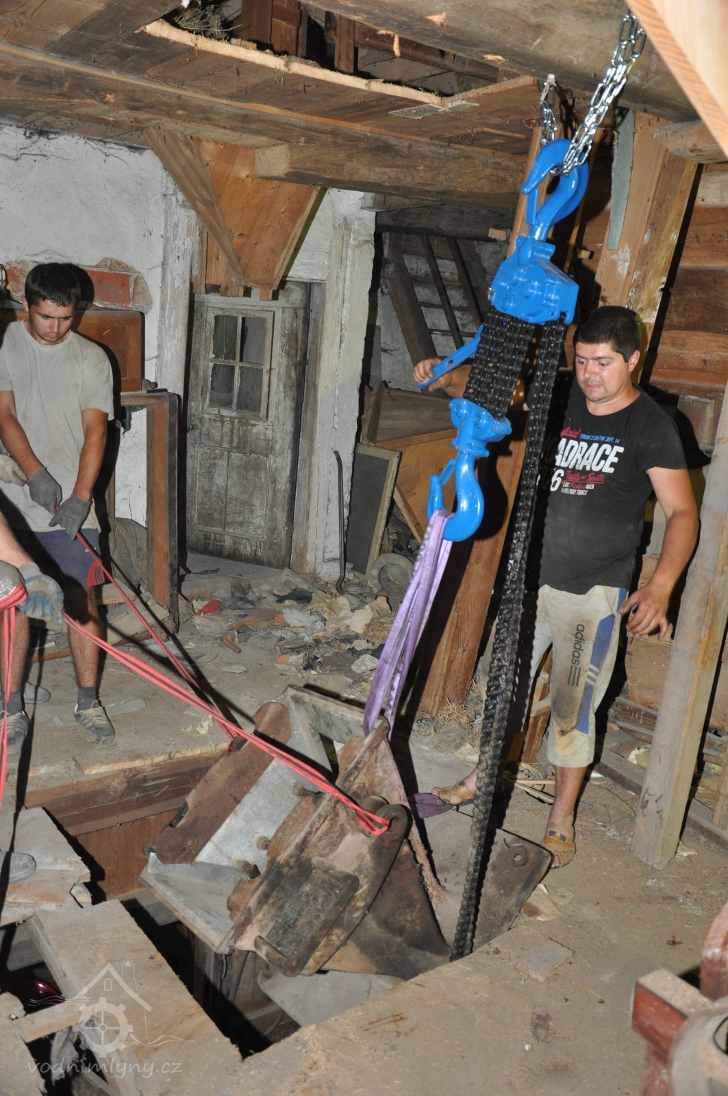 restaurátor strojů David Veverka provádí instalaci řetězového jeřábu pro manipulaci s demontovanými součástmi, 2015, © Anton