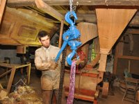 restaurátor strojů David Veverka provádí spouštění demontovaných částí strojního zařízení na řetězovém jeřábu pro převoz do muzejní expozice, 2015, © Anton