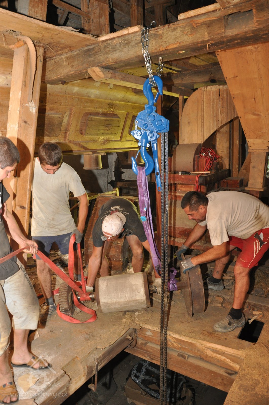 pohon 1. kamenného mlecího složení, 2015, © David Veverka, (Prvky na obrázku: transmise, řemenice, převody)