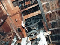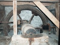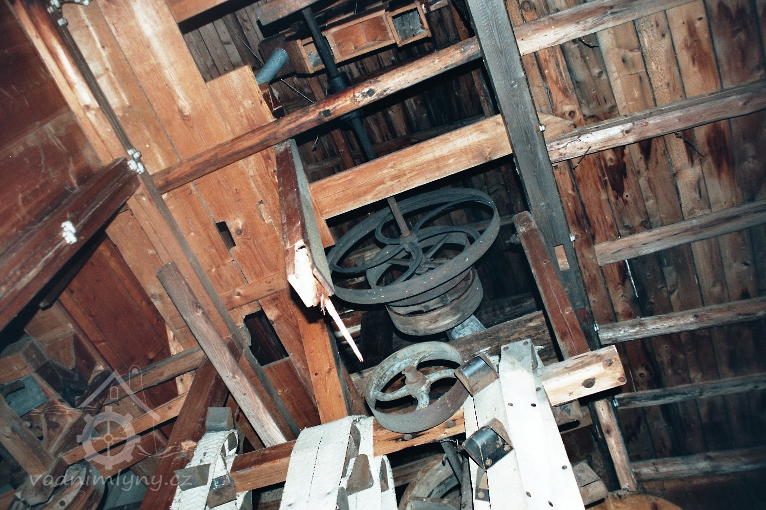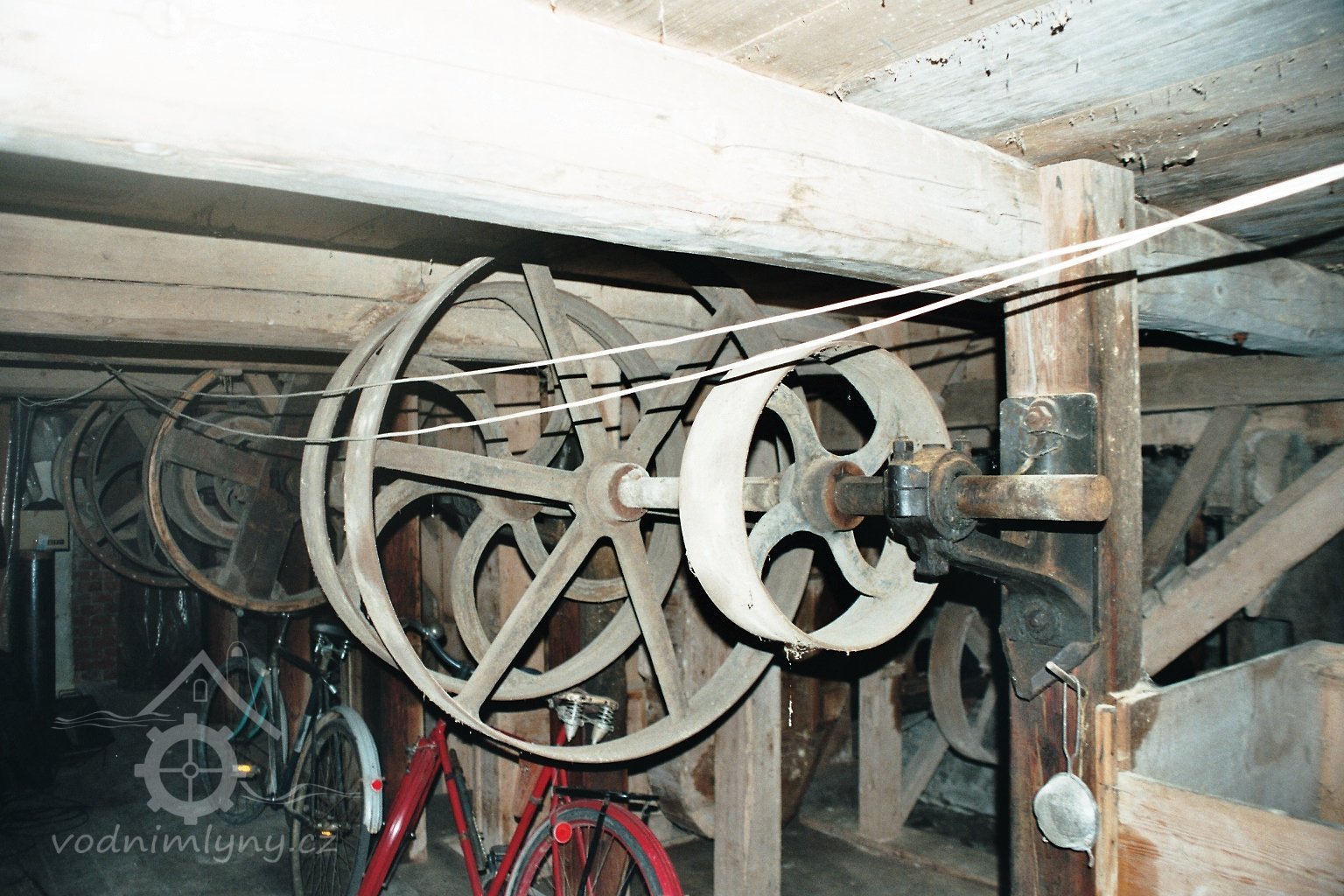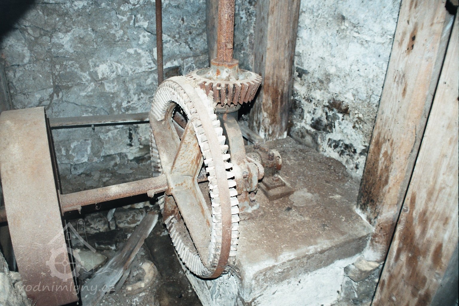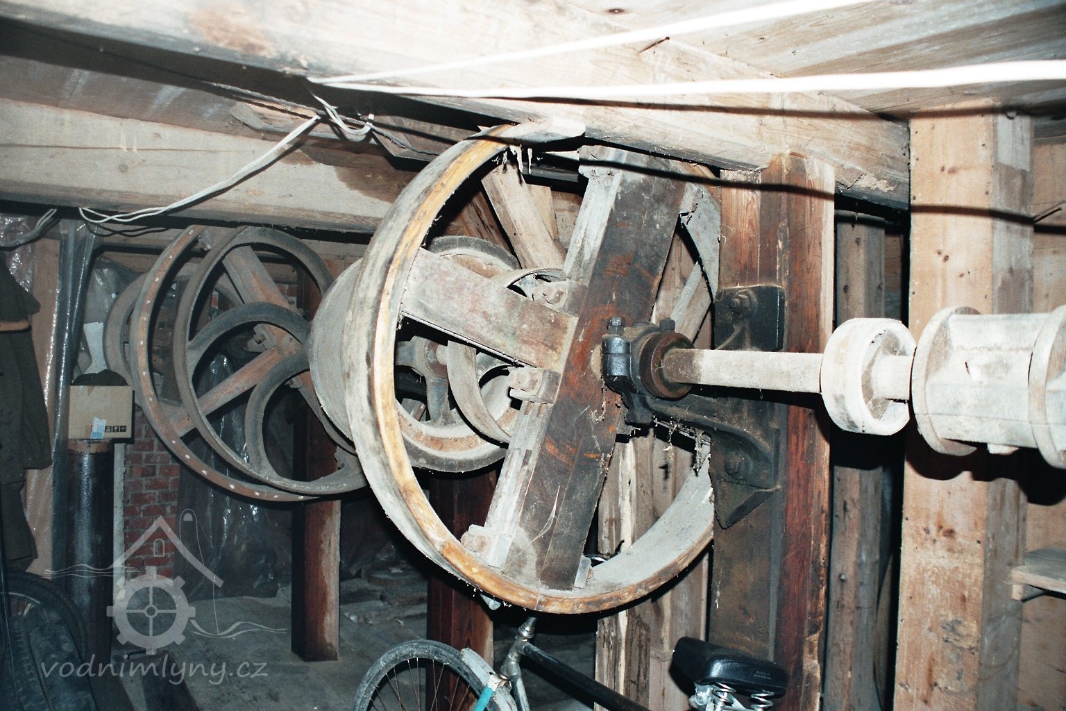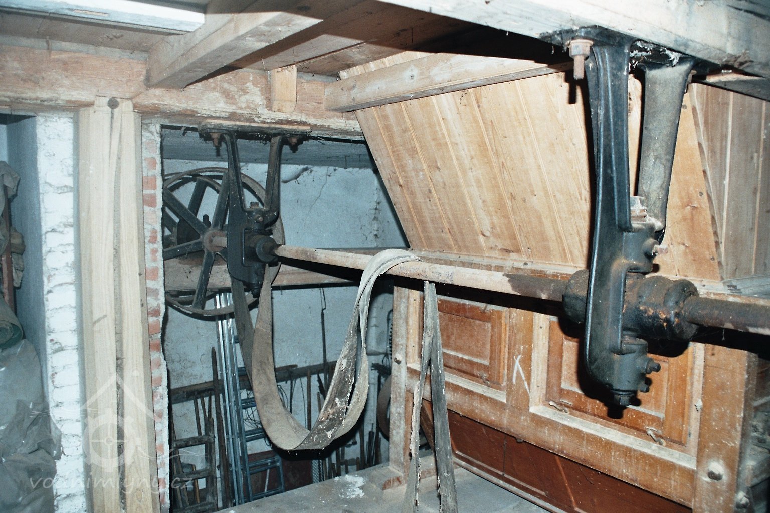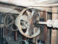 pravoúhlý převod mlecích kamenů v podkolí, 2008, © David Veverka, (Prvky na obrázku: transmise, řemenice, převody)