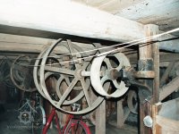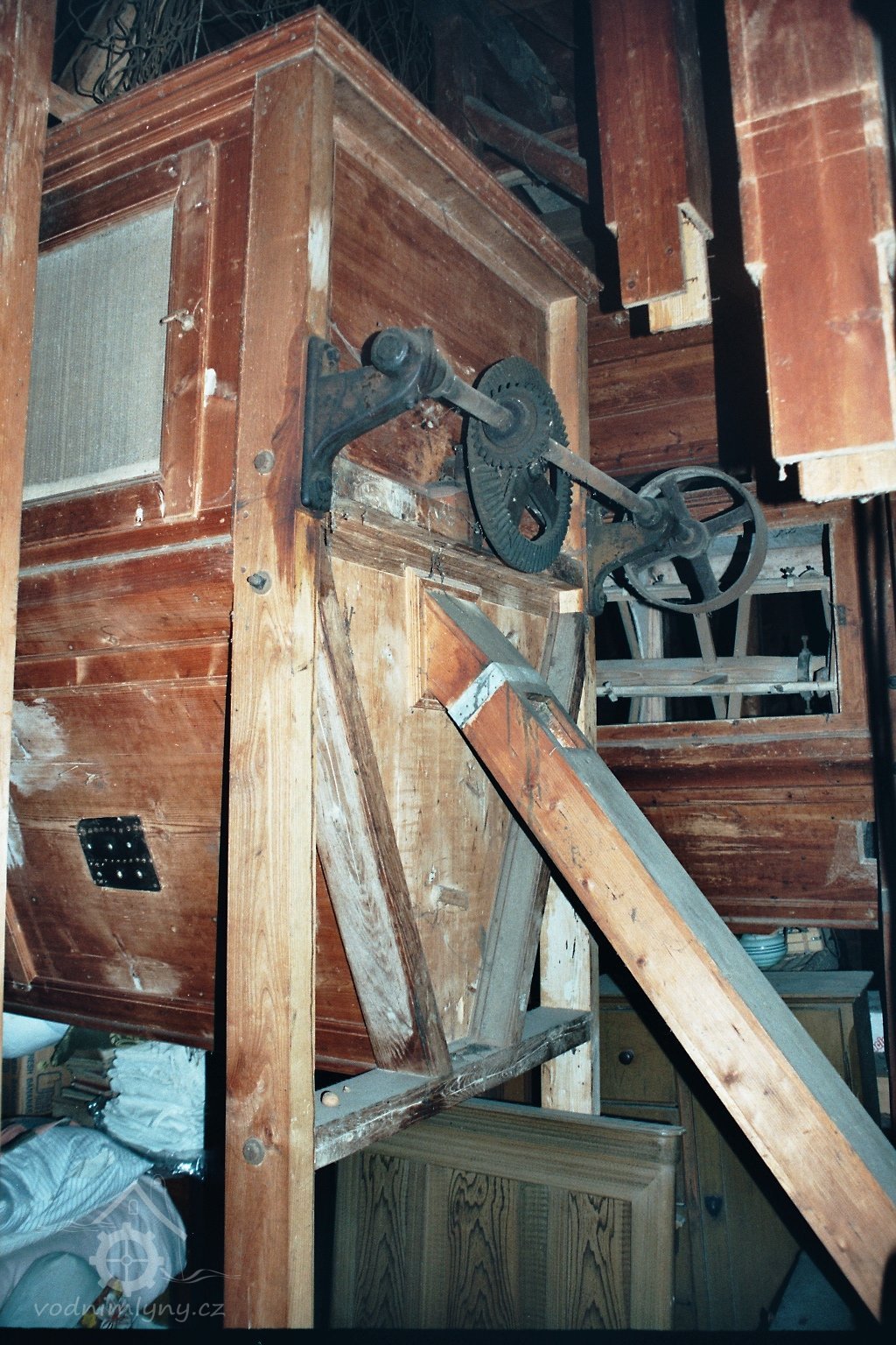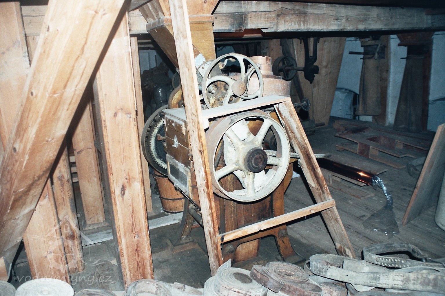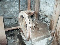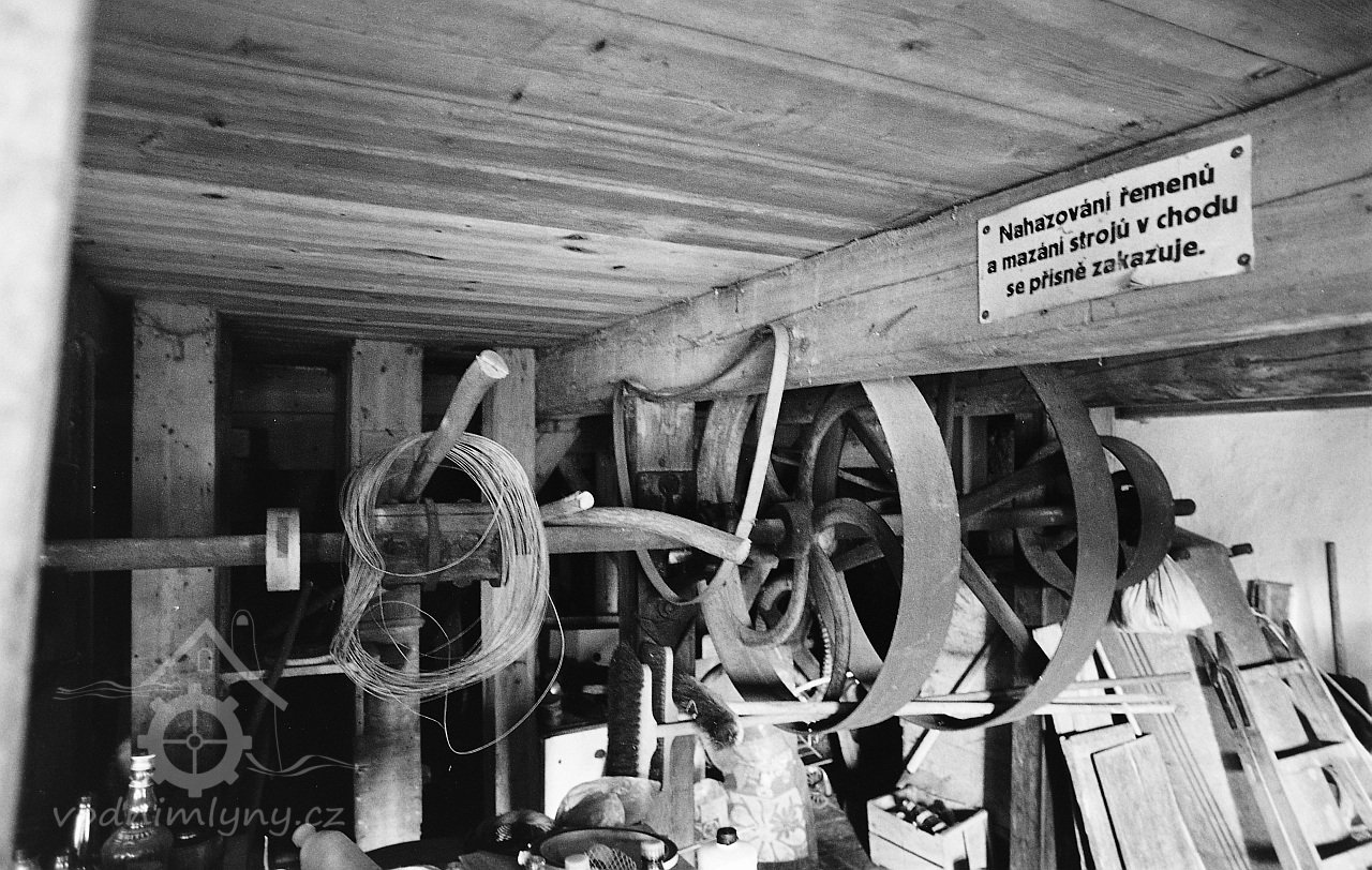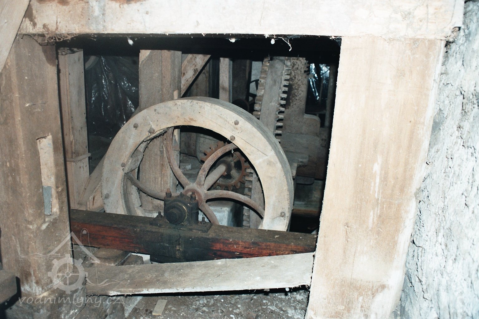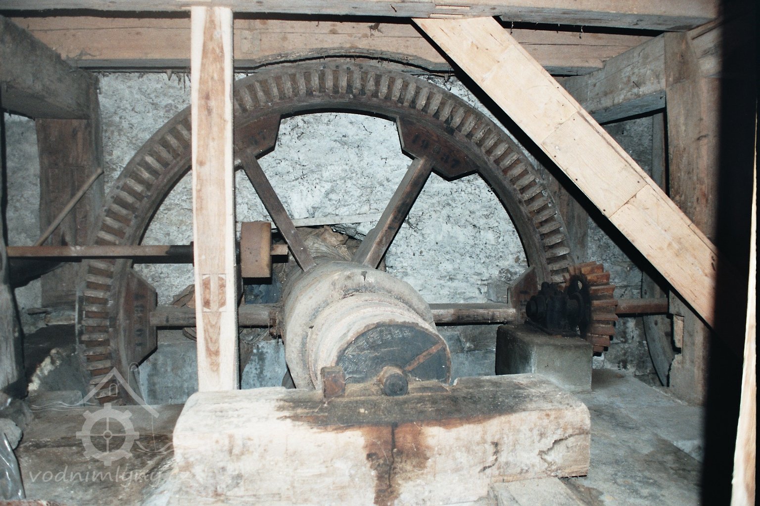 pravoúhlý převod mlecích kamenů v podkolí, 2008, © David Veverka, (Prvky na obrázku: transmise, řemenice, převody)