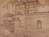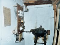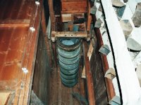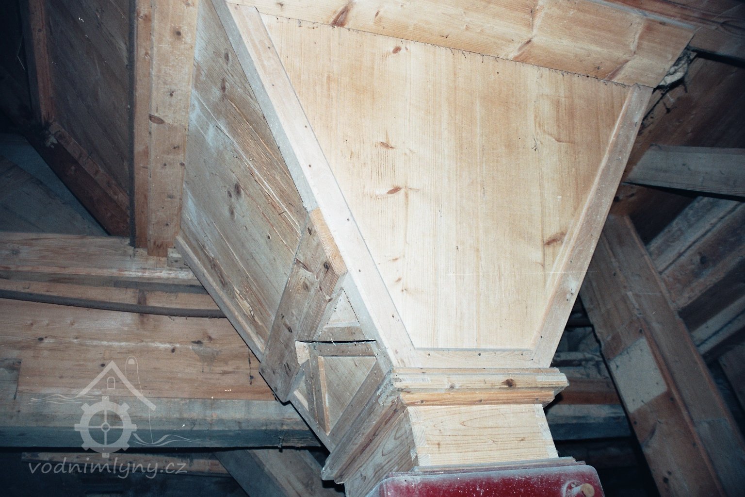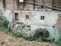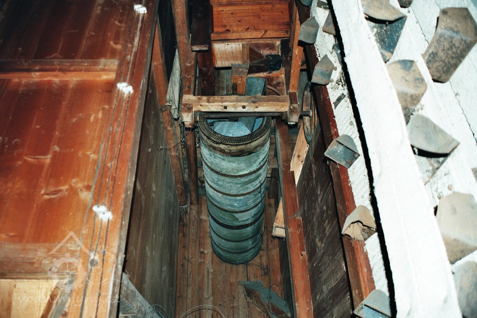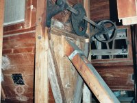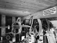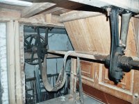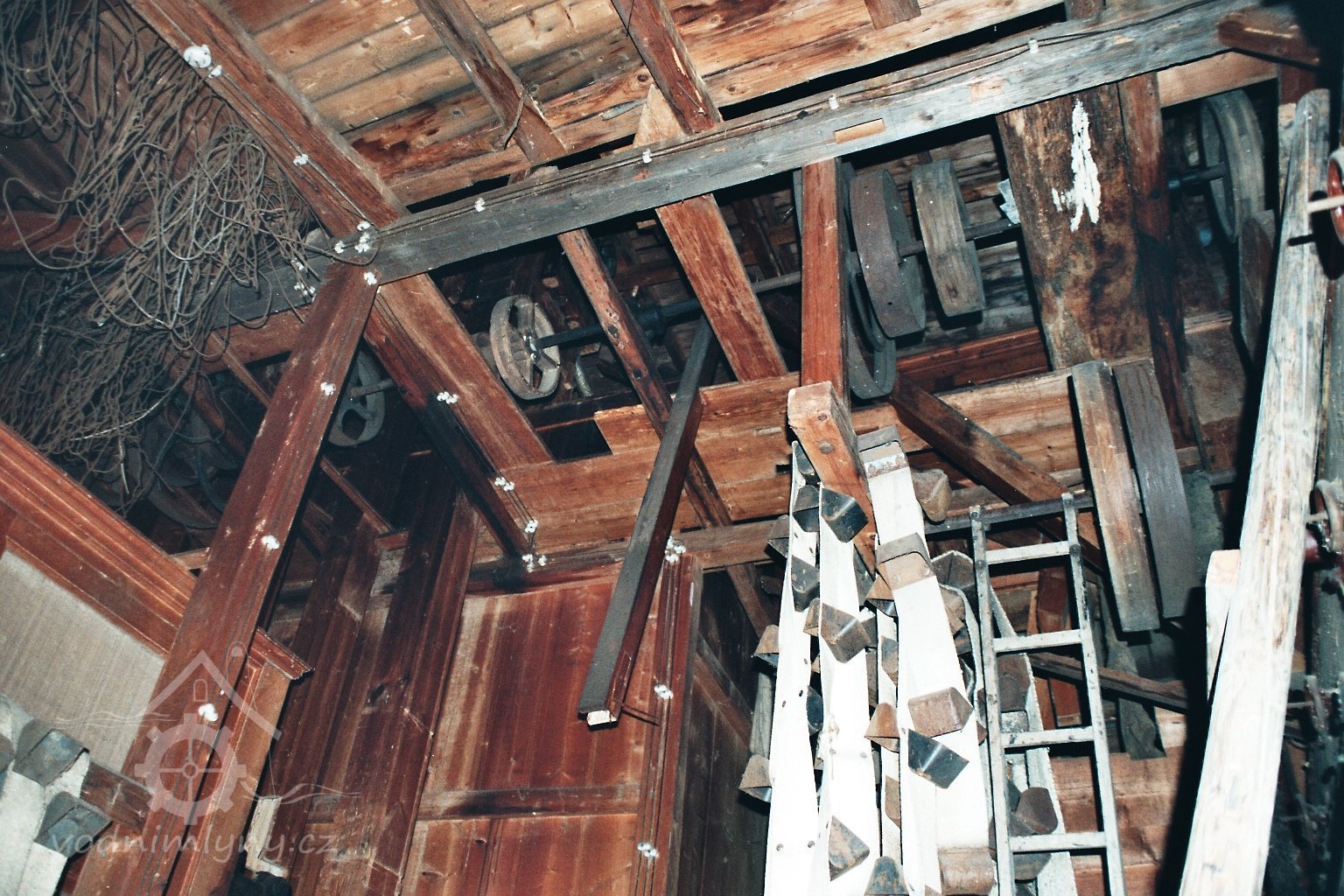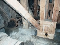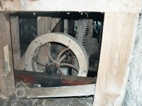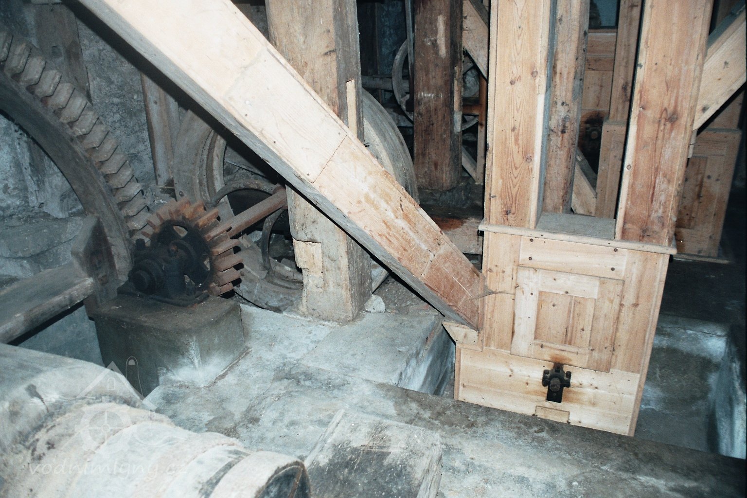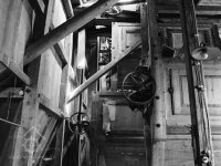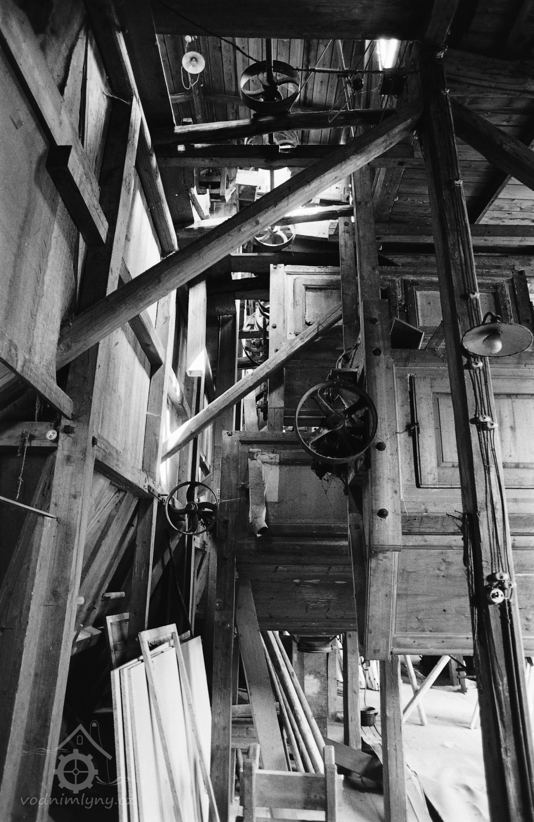 pravoúhlý převod mlecích kamenů v podkolí, 2008, © David Veverka, (Prvky na obrázku: transmise, řemenice, převody)