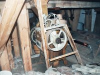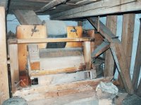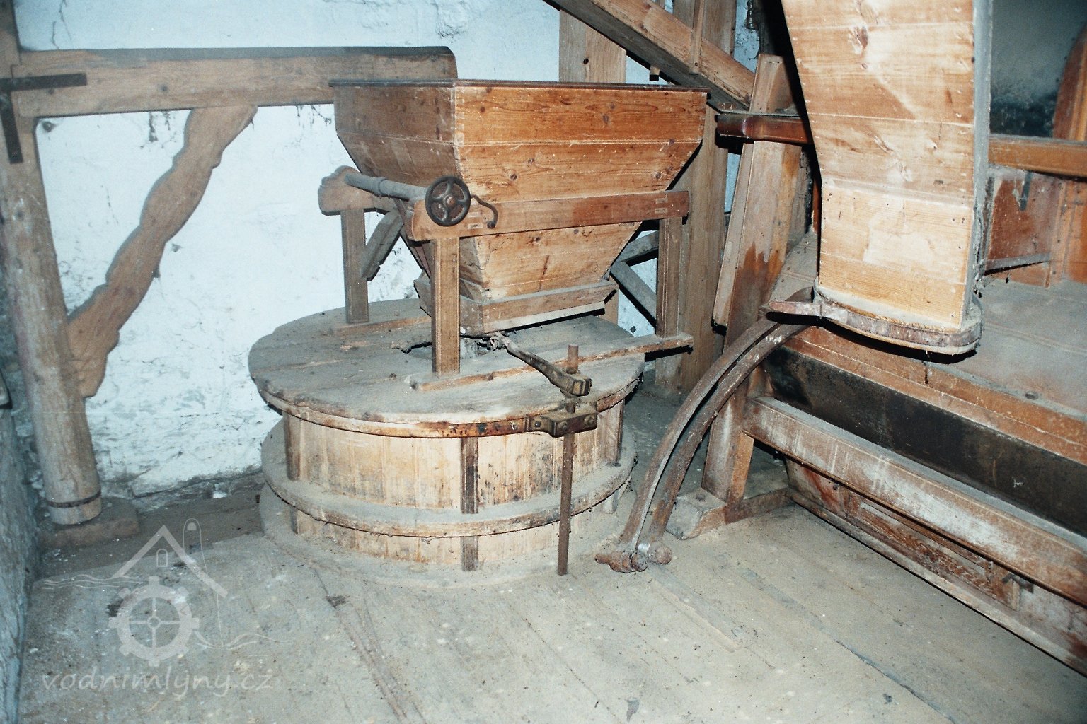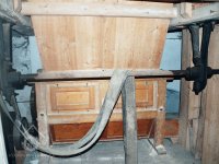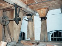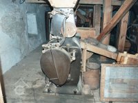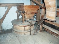 francouzké kamené mlecí složení, z boku je podavací mechanismus od zásobníku poháněný přes excentr, hřídel a řemeničku od hlavní hřídele, vidíme zde i zdobený jeřáb na zvedání mlecích kamenů, 2008, © David Veverka, (Prvky na obrázku: kamenné složení (šrotovací, mlecí))
