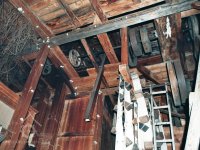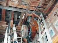 pohled na transmisi v podstřeší, 2008, © David Veverka, (Prvky na obrázku: transmise, řemenice, převody)