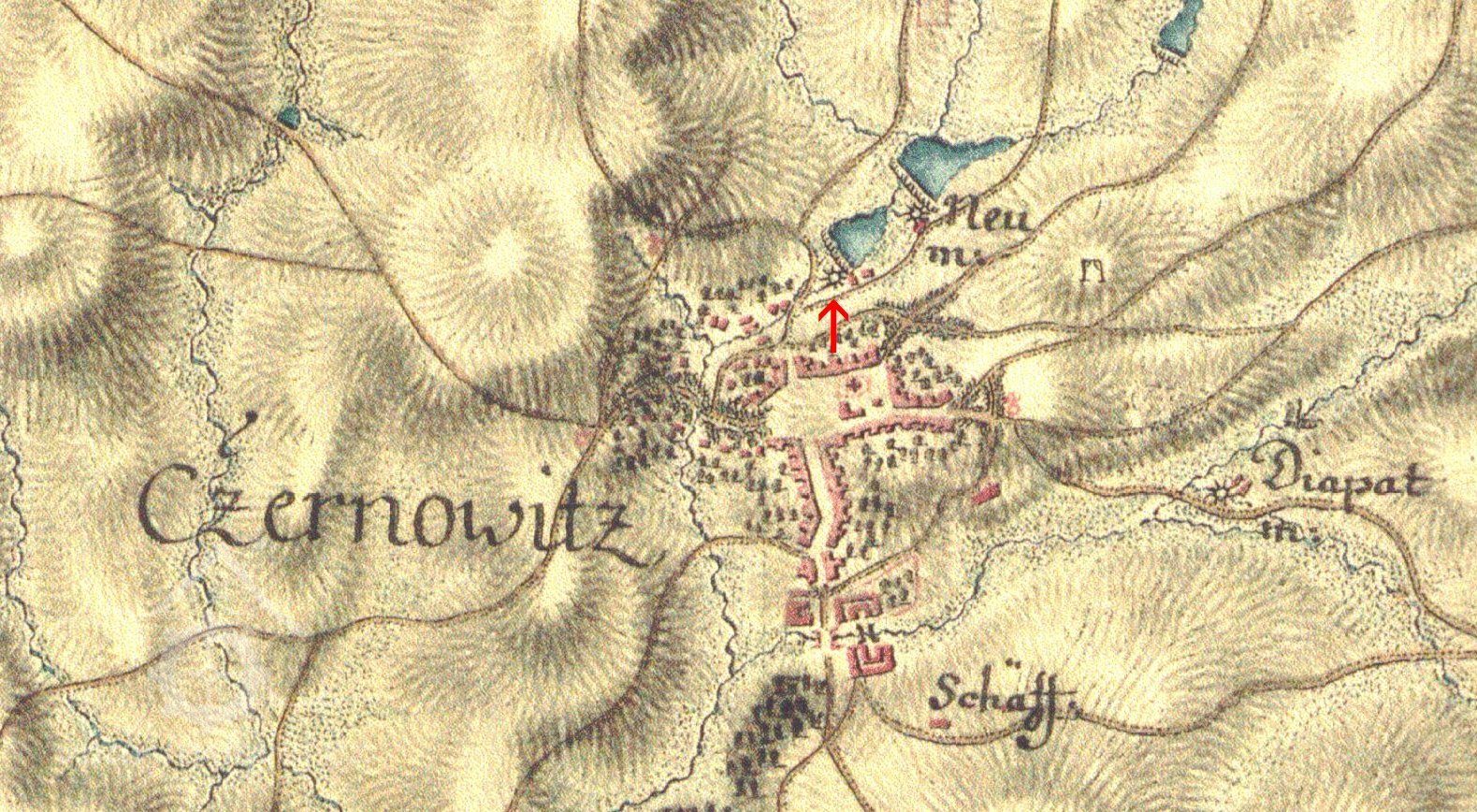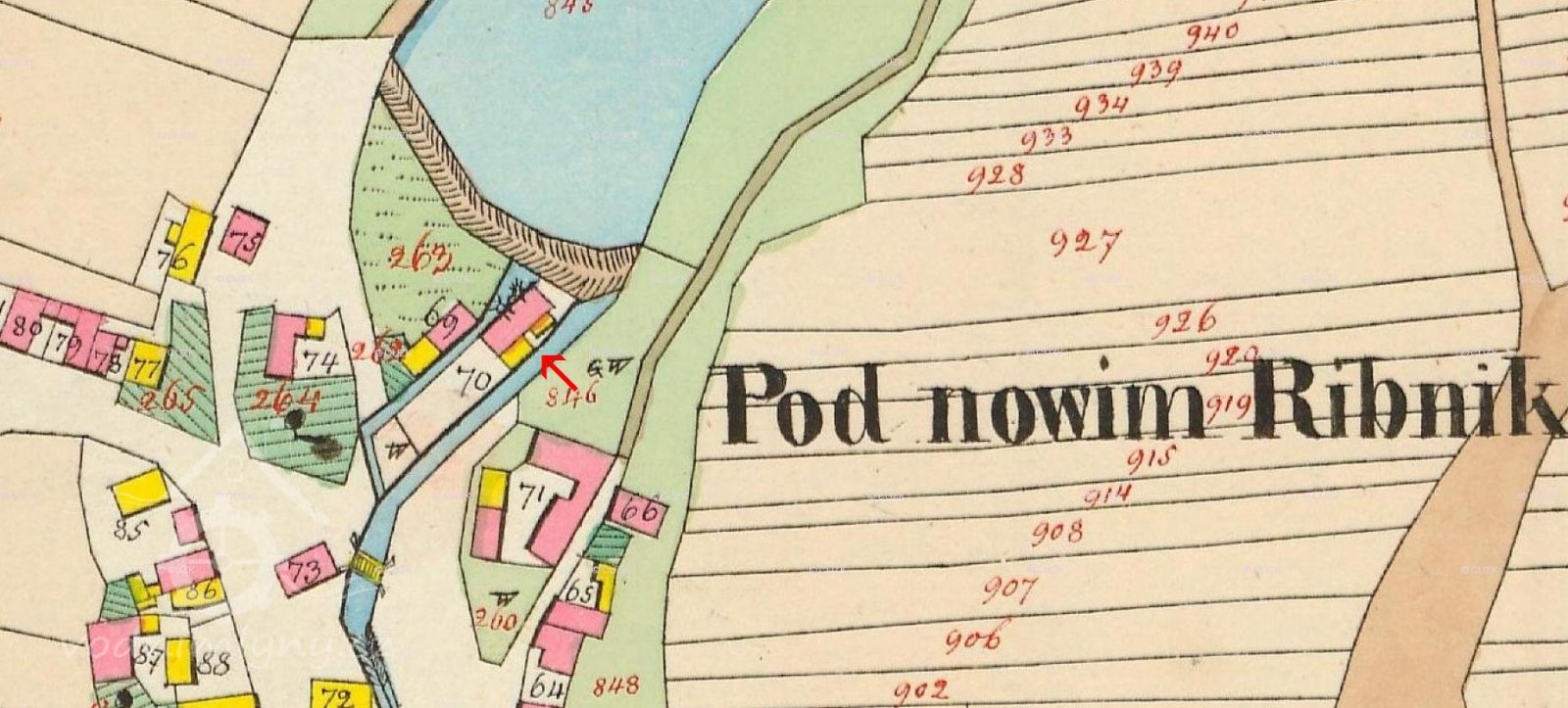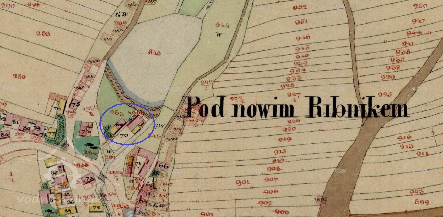 ...Melivo vozí se do šesti mlýnů ležících na dvou potocích. Z těch větší přitéká ode Lhotky a naplňuje nejprve rybník u mlýna na Vackově. Vackov je skupení jedenácti chalup kolem mlýna čtvrt hodiny cesty k východu od Černovic. Mlýn ten patříval před časy k Svatavě, ale r. 1596 k žádosti mlynáře Václava připojen jest od Petra Voka z Rozemberka k Černovicům. Blíže městu pod Vackovem protéká potok rybník u mlýna „Ťápalova“, kdež i pila se nalézá. Na SV. pod Moudrovem vzniká potok druhý, naplňuje rybníky „Hořejší“ a „Dolejší“ při mlýnech týchž jmen, ležících u samého městečka, odtud teče Předměstím a Pršínem, kdež je most kamenný se sochami sv. Jana Nepomuckého a sv. V8clava a při západní straně města běží do obory, kdež se spojuje s potokem prve dotčeným. Část vody shražená žene pod oborou mlýn „Šelichův“ a ještě dpleji naplňuje rybník hluboký s koupadlem u mlýna Louckých. V létech suchých potoky tak málo vody rybníkům dodávají, že jen po přestávkách, vždy až se rybník naplní, mlýti se může... (pep)